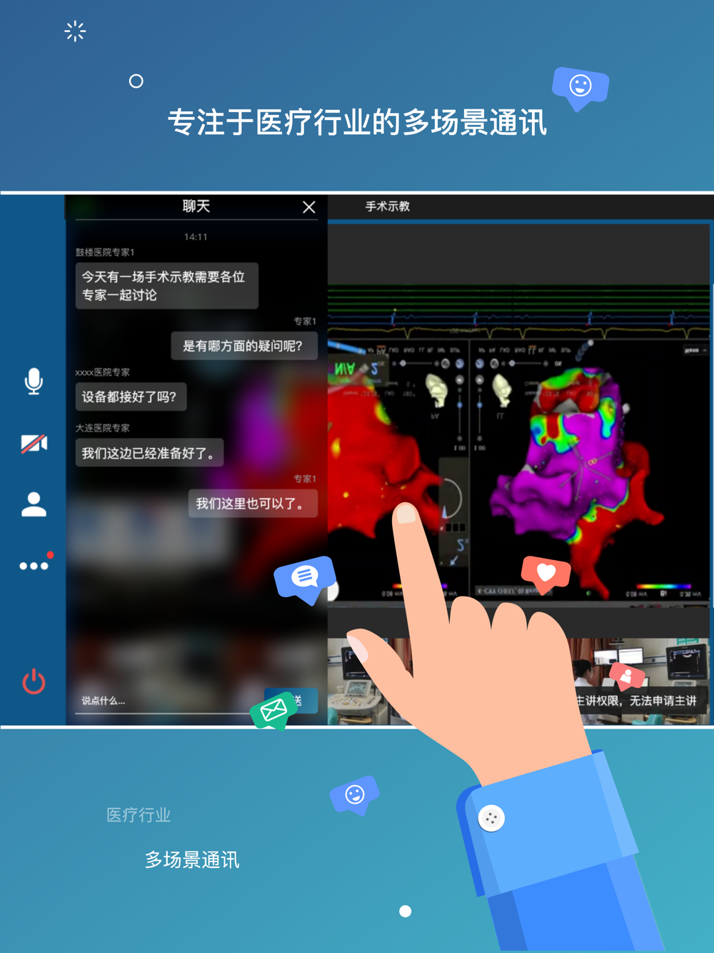 VISMed是一款全新复合型结构的医疗通讯业务管理平台,也是一个医疗多场景应用平台,同时还可以根据用户需求打造成数据平台或内容平台,满足多种院内信息化、数字化的需求。可满足医疗行业各种远程通讯业务场景的实际需求,如手术示教、视频会议、MDT、查房会诊、影像诊断、数字化手术室等。具有音画同步、实时通讯、多画面布局等多种视频会诊功能,可使用VIS公有云业务,也可配合院内部署的VIS系统实现远程医疗相关的多场景业务,全方位助力服务医疗各个场景。