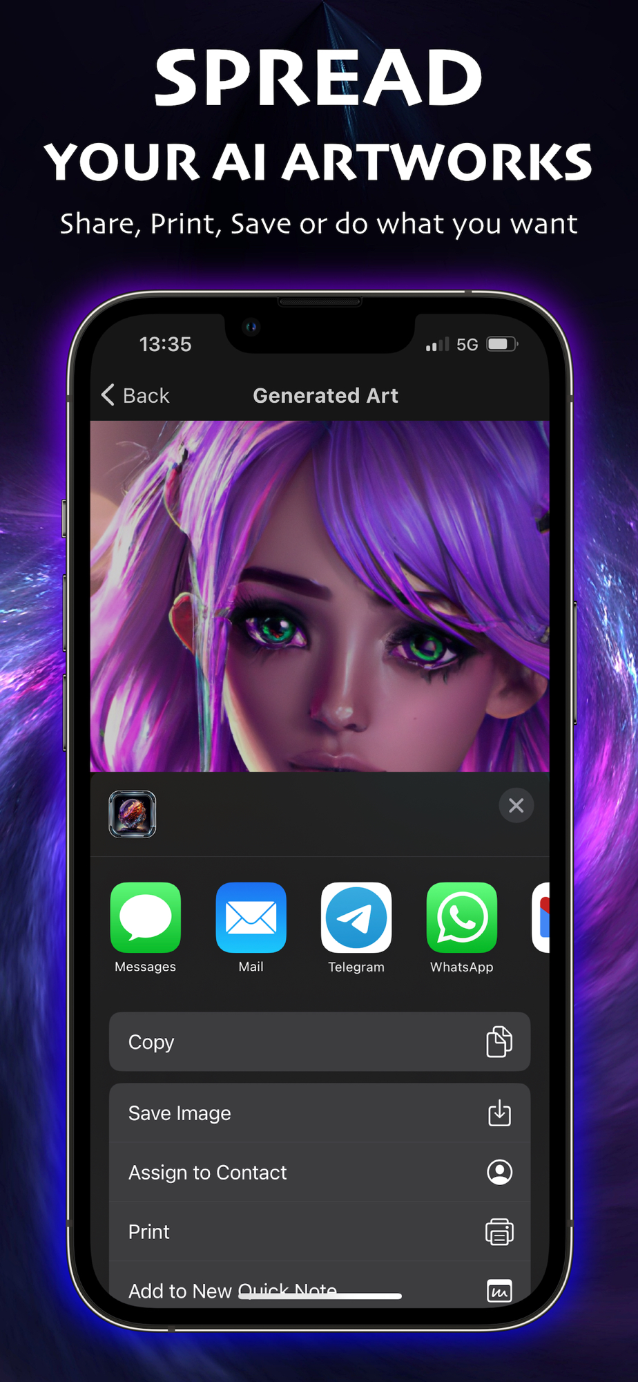 Unleash your creativity to generate unique piece of art. Enter the prompt, then select an art style, and AI will draw artwork in just seconds. Also, you can retry generation if you are not satisfied with the result, save art on your device, print or share it and do whatever you want. Note: The more details you provide, the better the results will be.