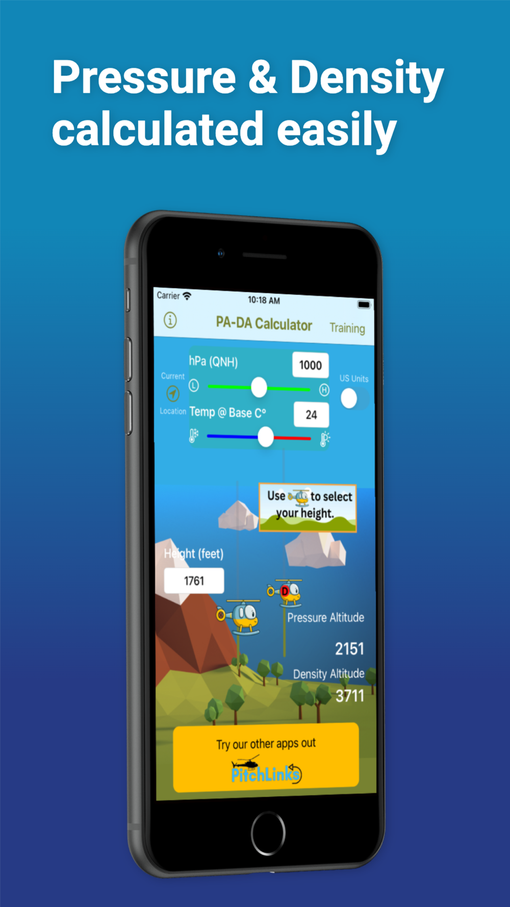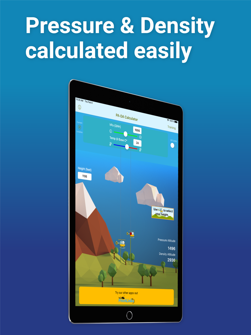 If you struggle to work out PRESSURE and DENSITY altitudes then this simple calculator is for you. Simply slide 'Choppy' up and down to set your height and move the pressure and temperature sliders and the calculator will deliver the answer.