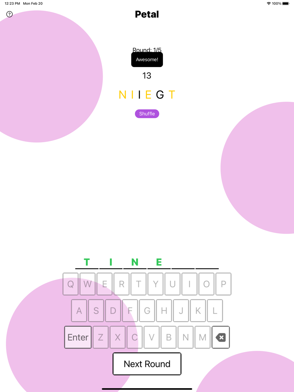 Petal the new word game that challenges your problem-solving skills against the clock, while also letting you support an important cause - affordable access to abortion services across the United States! Each round, your goal is to type any word that is 4 letters or longer using only the letters provided. There will always be at least one word that uses all the available letters and the longer the word - the more points you receive! But be careful, you start with only 15 seconds, any additional time is carried over to the next round and the faster you complete all 5 rounds, the higher your score multiplier will be at the end! So how does this game help? Like many free games, Petal runs ads, and 95% of all revenue generated is donated to organizations across the country that support women through all stages of the process. The extra 5% is reinvested into our app so we can grow and help as many people as possible!