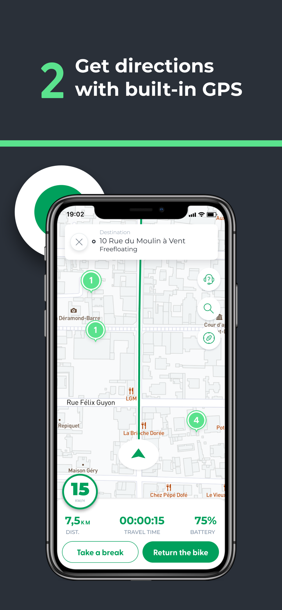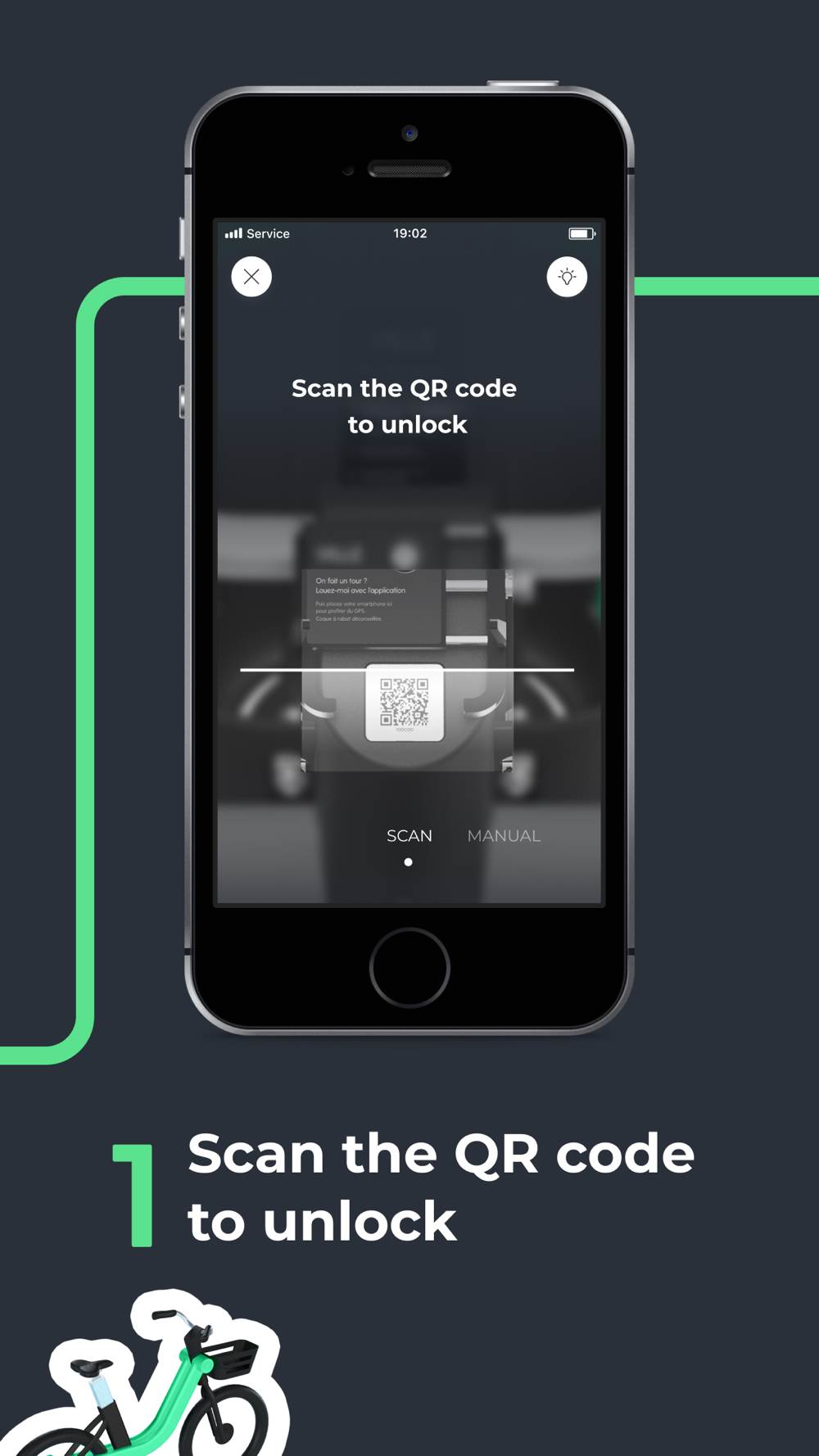 Open the app to find an electric bike nearby. Unlock it straight away by scanning the QR code. Whoosh, you’re already gone.