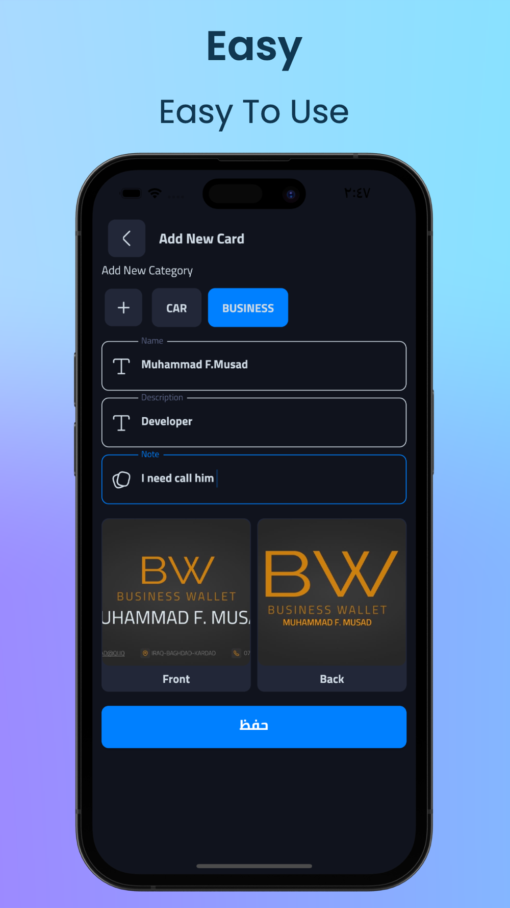 تطبيق المحفظة يسمح للمستخدم بالاحتفاظ بجميع الهويات الخاصة به في مكان واحد مما يسهل عليه خزن جميع الهويات بأمان واسترجاعها بسهولة مما يوفر له الوقت والجهد, ويقوم التطبيق بقراءة المعلومات وتثبيتها وان لكل مستخدم له business card الخاصة به التي يقوم من خلالها بالدفع