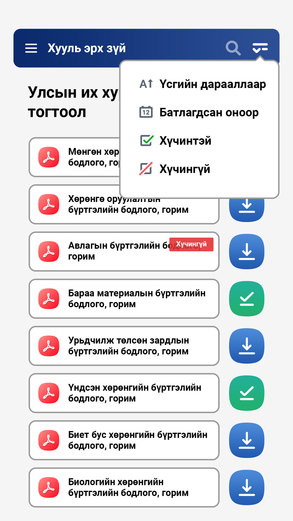 Энэ аппликейшн нь газар нутаг, орон зайнаас үл хамааран цахим хэлбэрээр Байгаль орчны салбарын хууль, дүрэм, журам, жагсаалт, стандарт, сайдын тушаал, захиргааны хэм хэмжээ тогтоосон актыг интернэтэд холбогдоогүй буюу офлайн хэлбэрээр харах боломжтой.