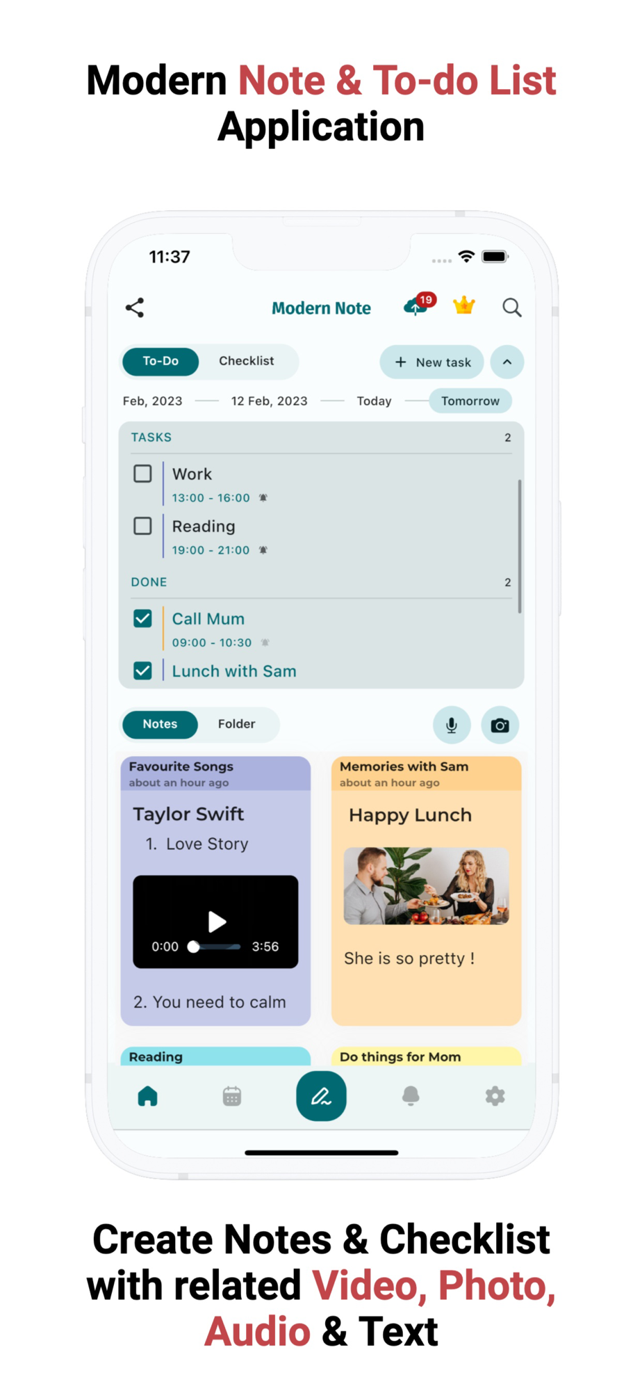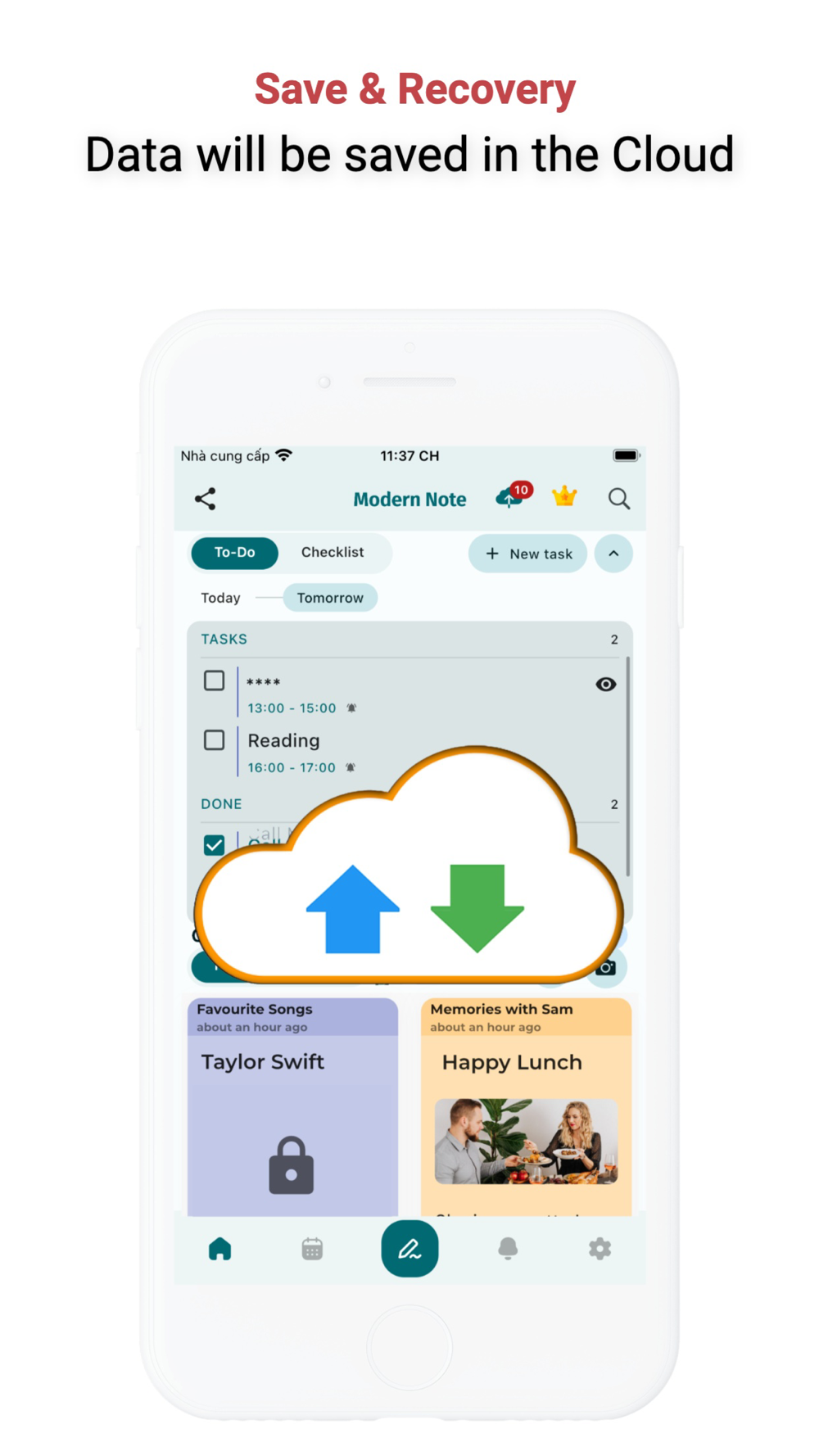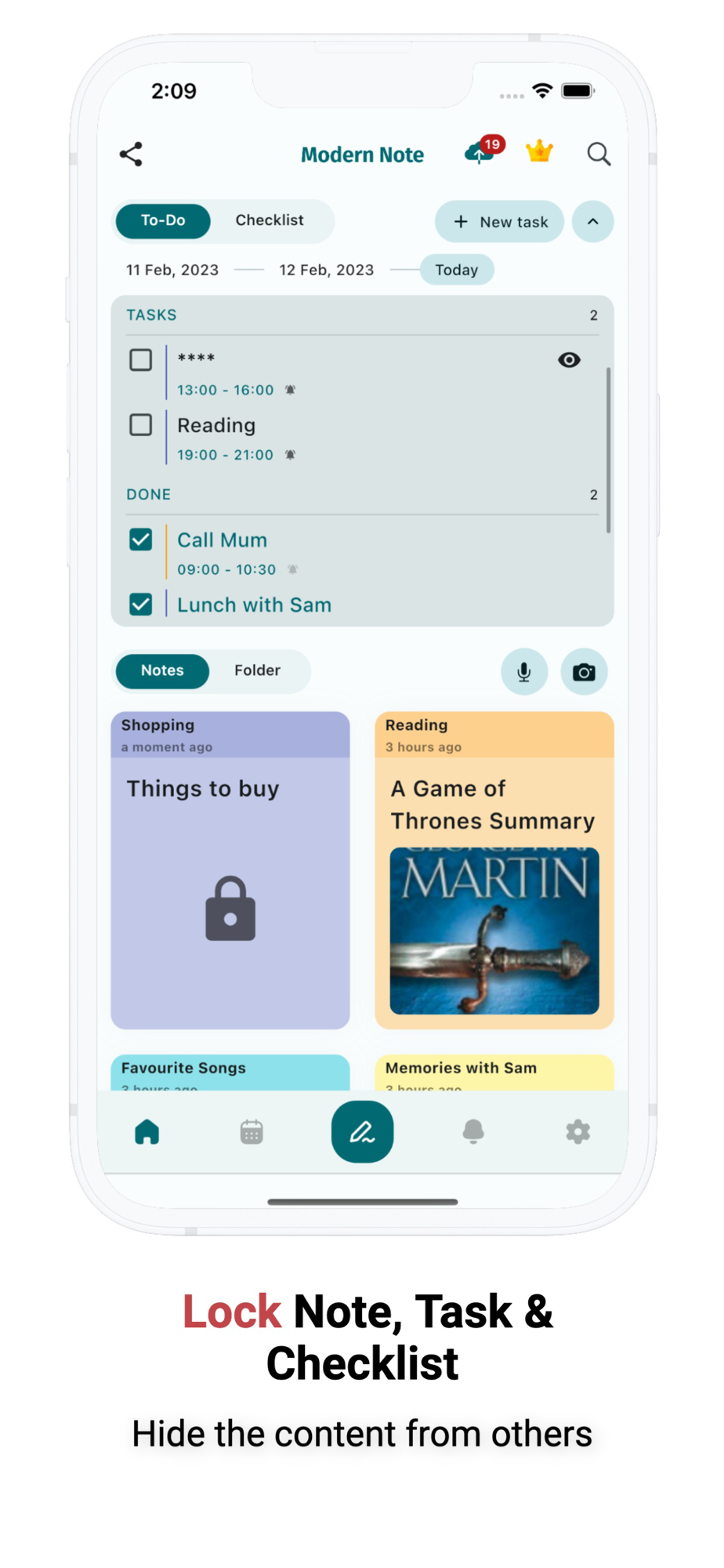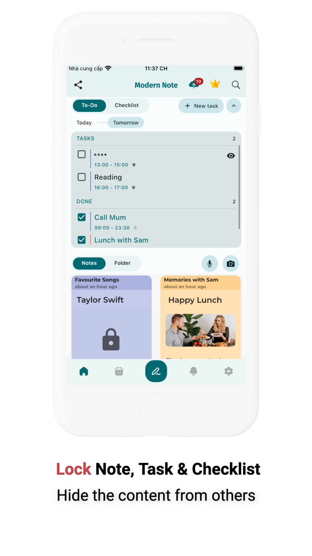 Support writing out the to-do list, checklist and remind users with notifications. Especially with the feature of locking notes and tasks so that other people can't see the content.