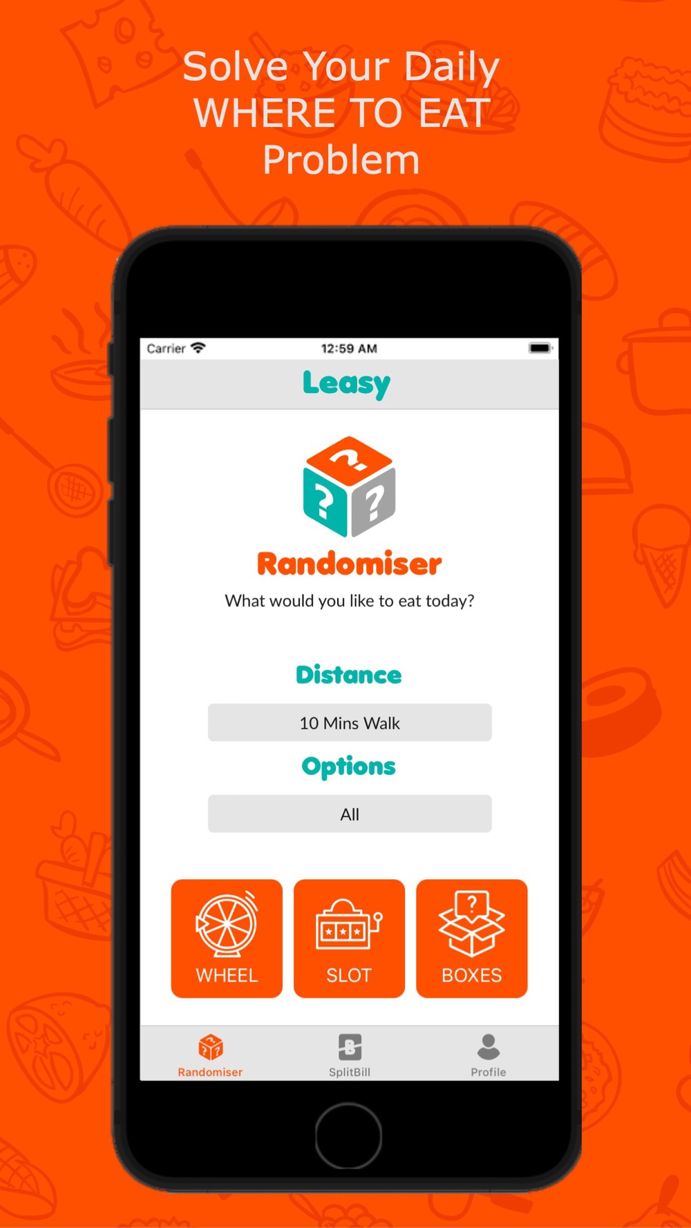Leasy randomises places nearby you and suggests 3 places to eat according to how far you are willing to go and the type of food or drinks you are looking for. You will never be bored with our selections of randomisers.