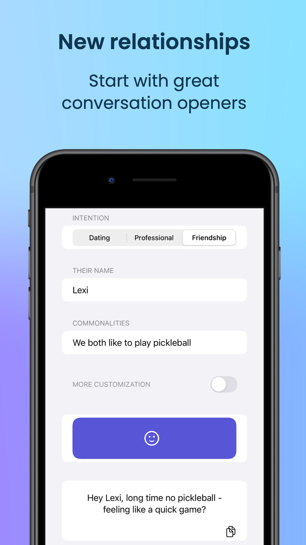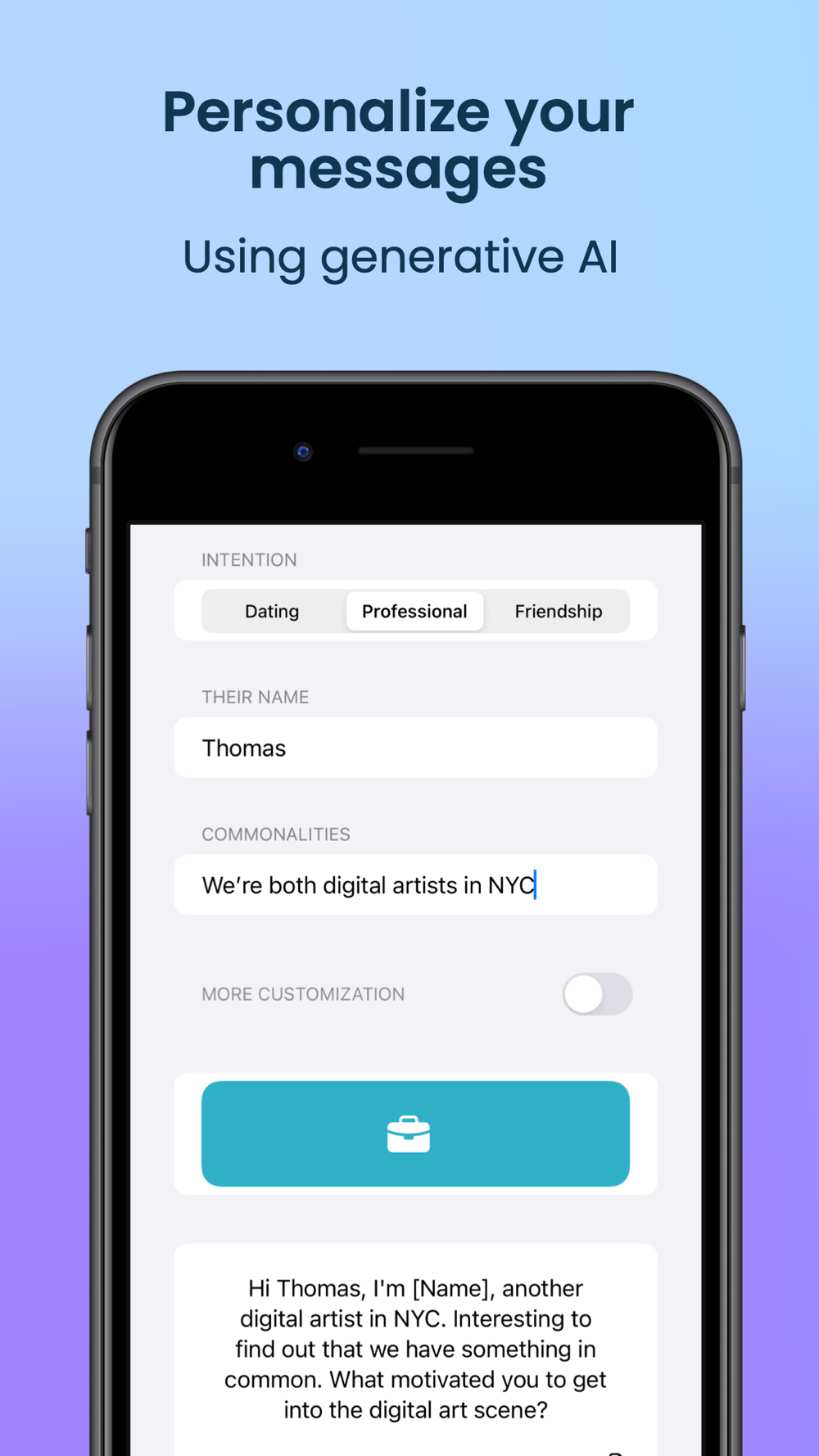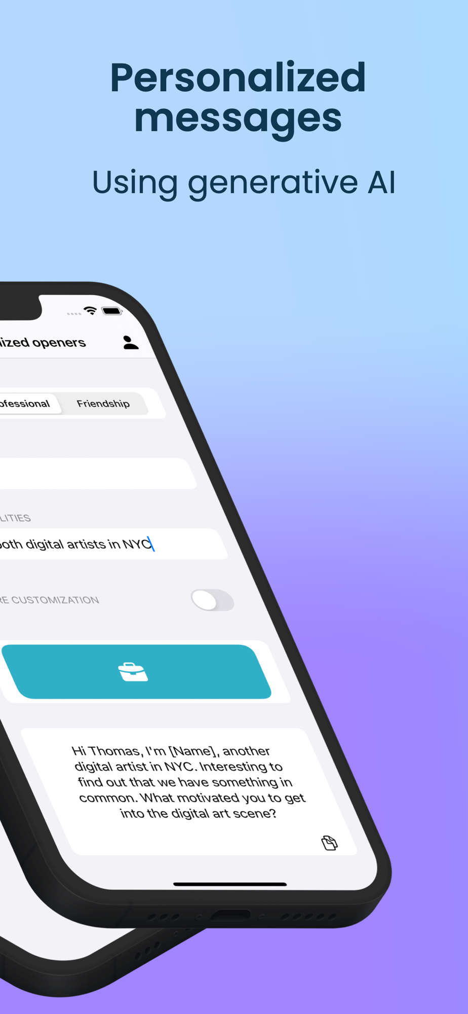 It will generate messages that are personalized to your recipient. Use it for getting replies on dating apps, LinkedIn, and DM's.