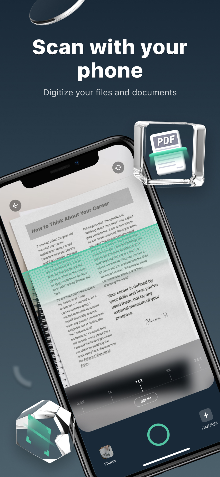 Convert a wide variety of pictures to PDF. You can use your camera to import photos or scan paper documents and convert them to PDF files such as notes, receipts, invoices, forms, business cards, certificates, whiteboards, ID cards, etc.