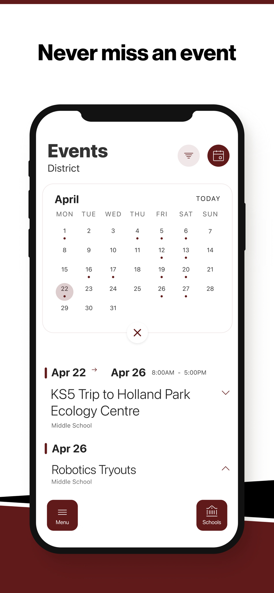 The event section shows a list of events throughout the district. Users can add an event to their calendar to share the event with friends and family with one tap.