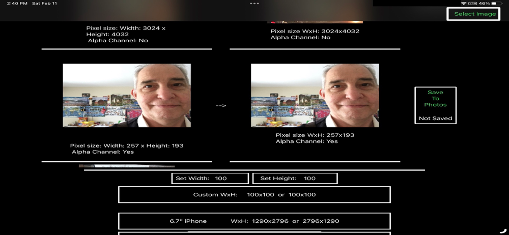 This app will take any Photo ( Screen Shot )in the users camera roll and resize it to any width and height, storing the result back to the Photos camera roll. The resized screenshot will have no alpha channel meaning the photo is opaque and can be uploaded to the App Store Connect for app submission. This App created the screenshots used here.