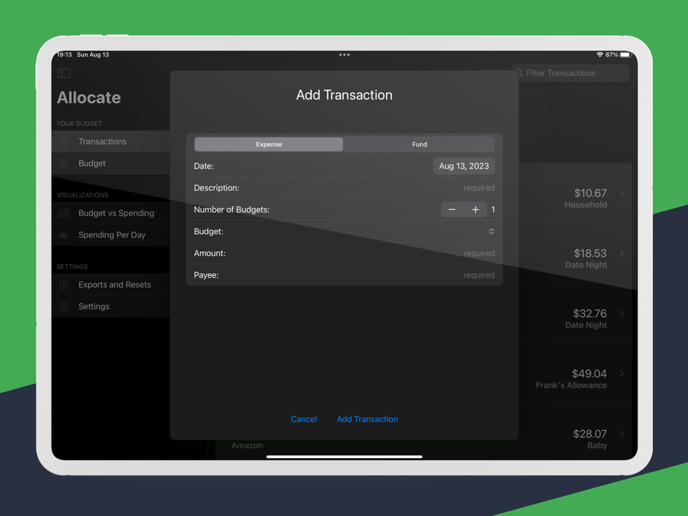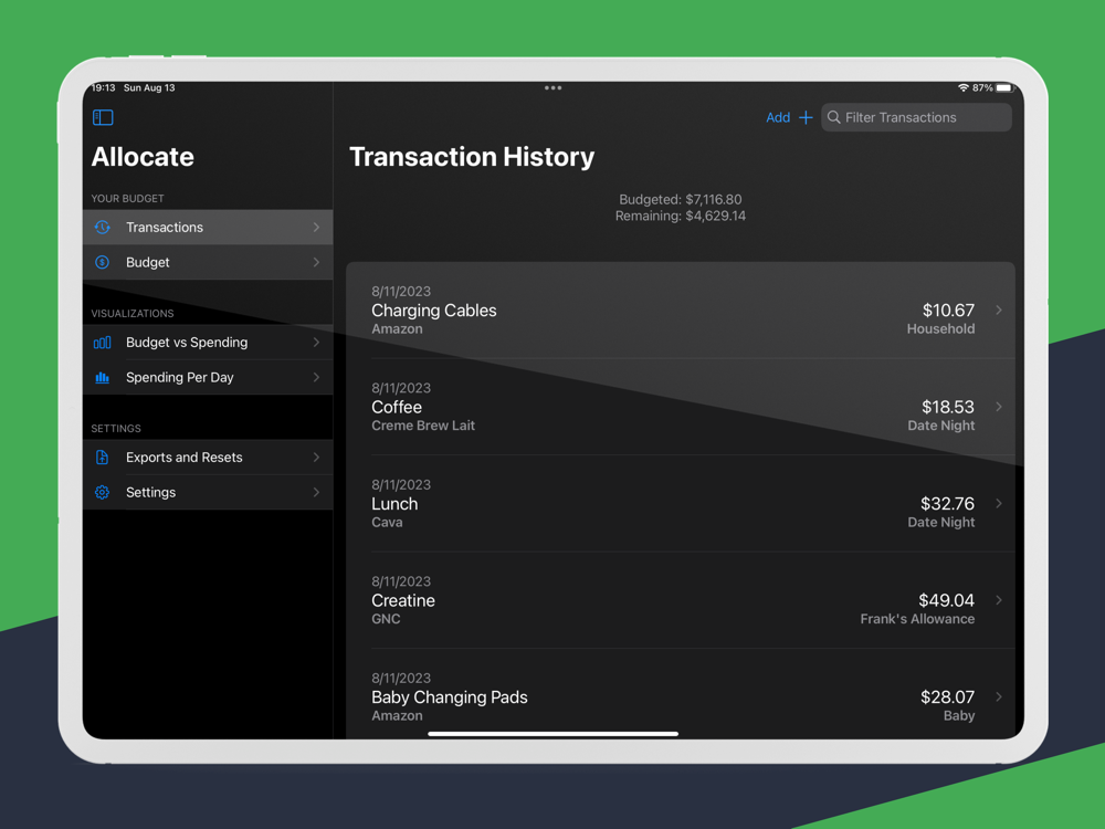 For many, manually entering transactions is the first step to familiarizing yourself with - and taking control of - your finances. This application allows your to easily monitor your transactions and budget status across iOS, iPadOS, and MacOS.