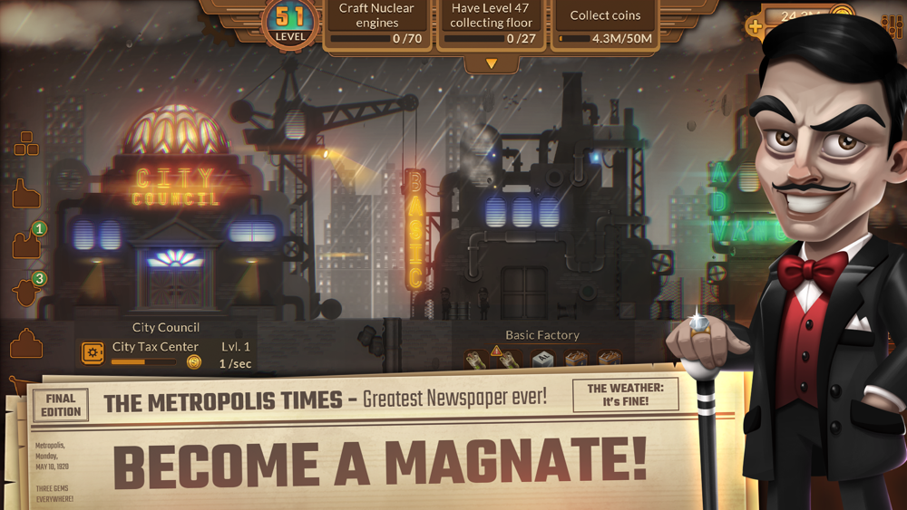 Metropolis Tycoon is a black and white 1920's noir idle game and mining simulator with aliens and tentacles... Don't judge. Whether you are looking for gold rush games or offline idle games to play in your leisure, install this idle empire and have fun.
