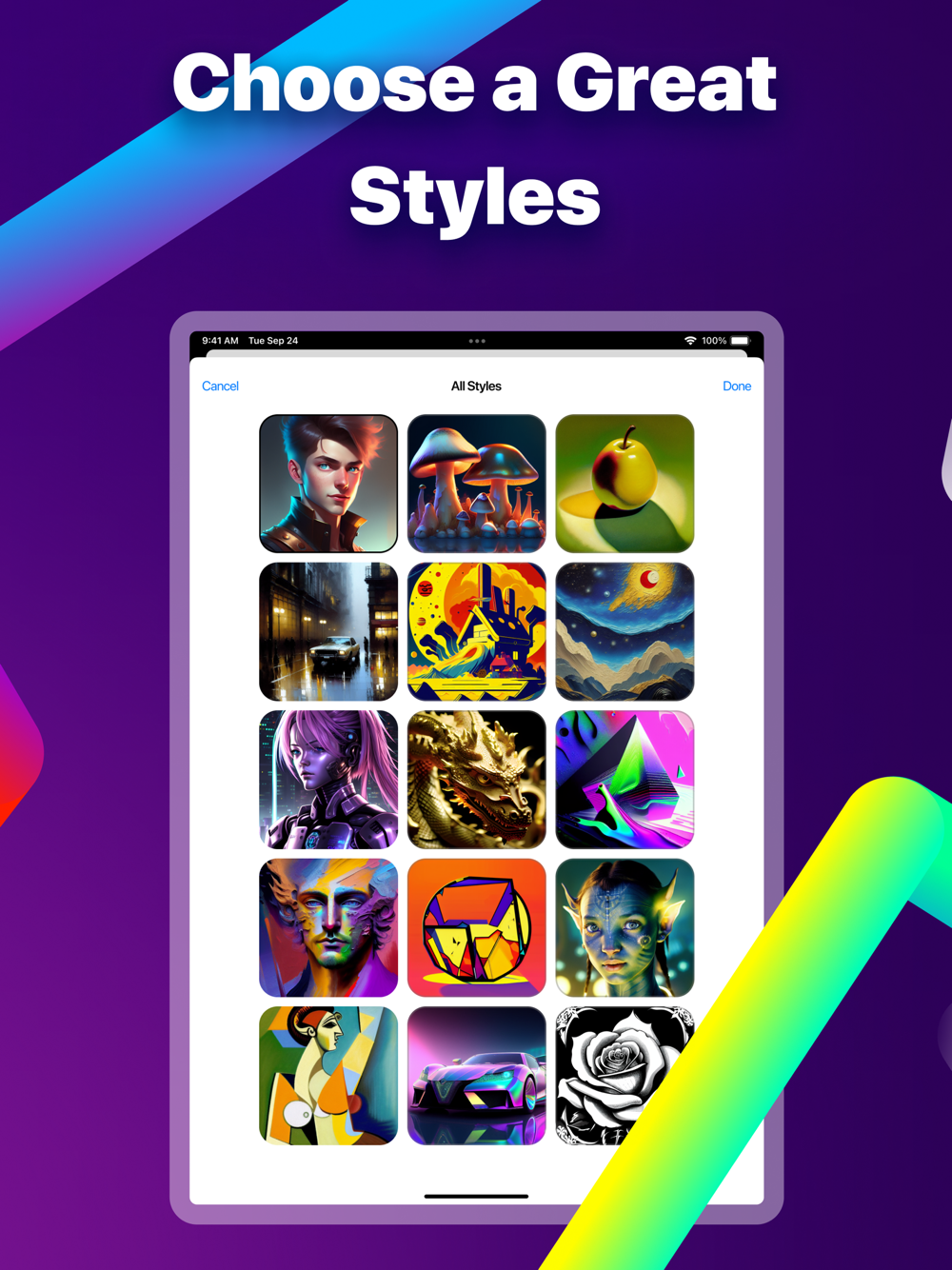 Create amazing paintings with artificial intelligence. Use the best app with an intuitive interface. Just enter text or select cues, choose a style, and in seconds you'll have a unique work of art.