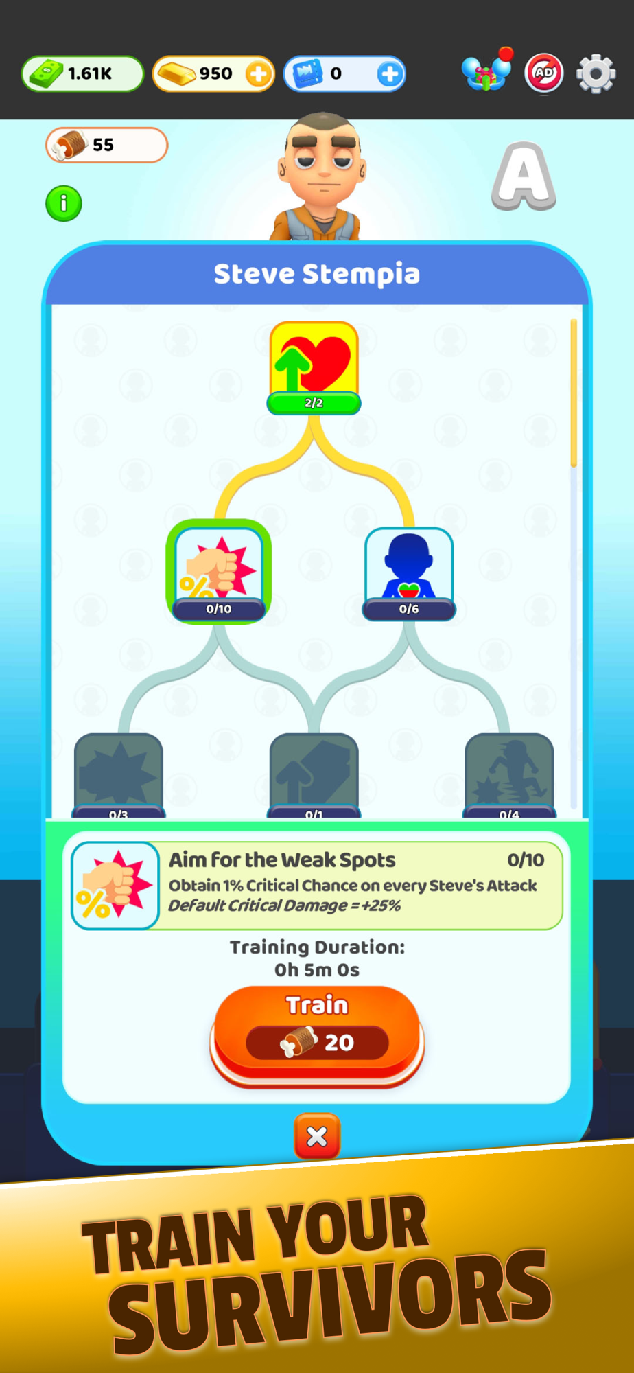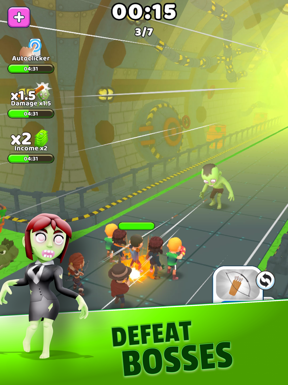 Surviving the zombie apocalypse is more fun with company. Recruit melee and ranged allies to join Steve's party. Merge them for enhanced power and unlock new ally slots using ingots or ads.