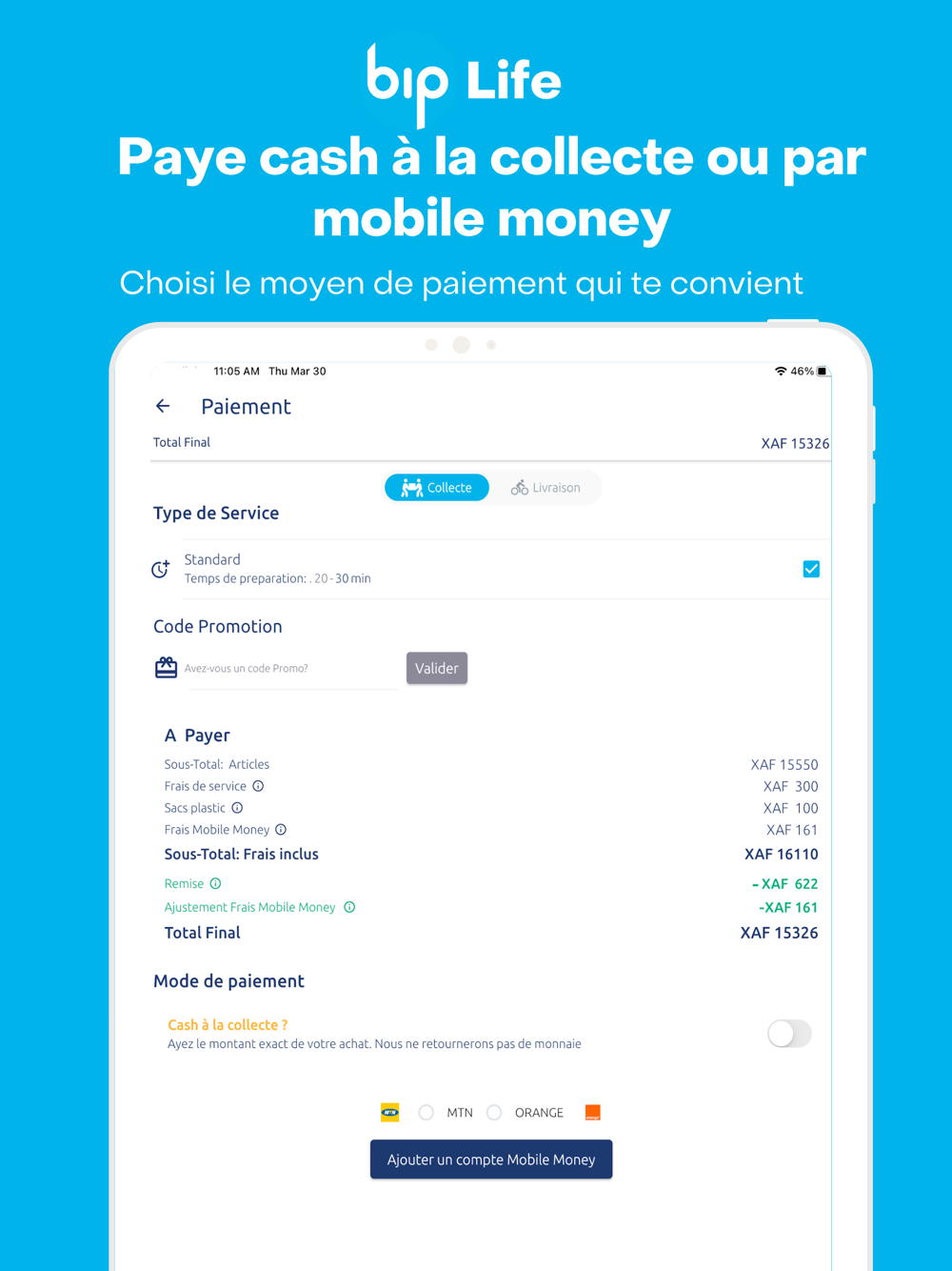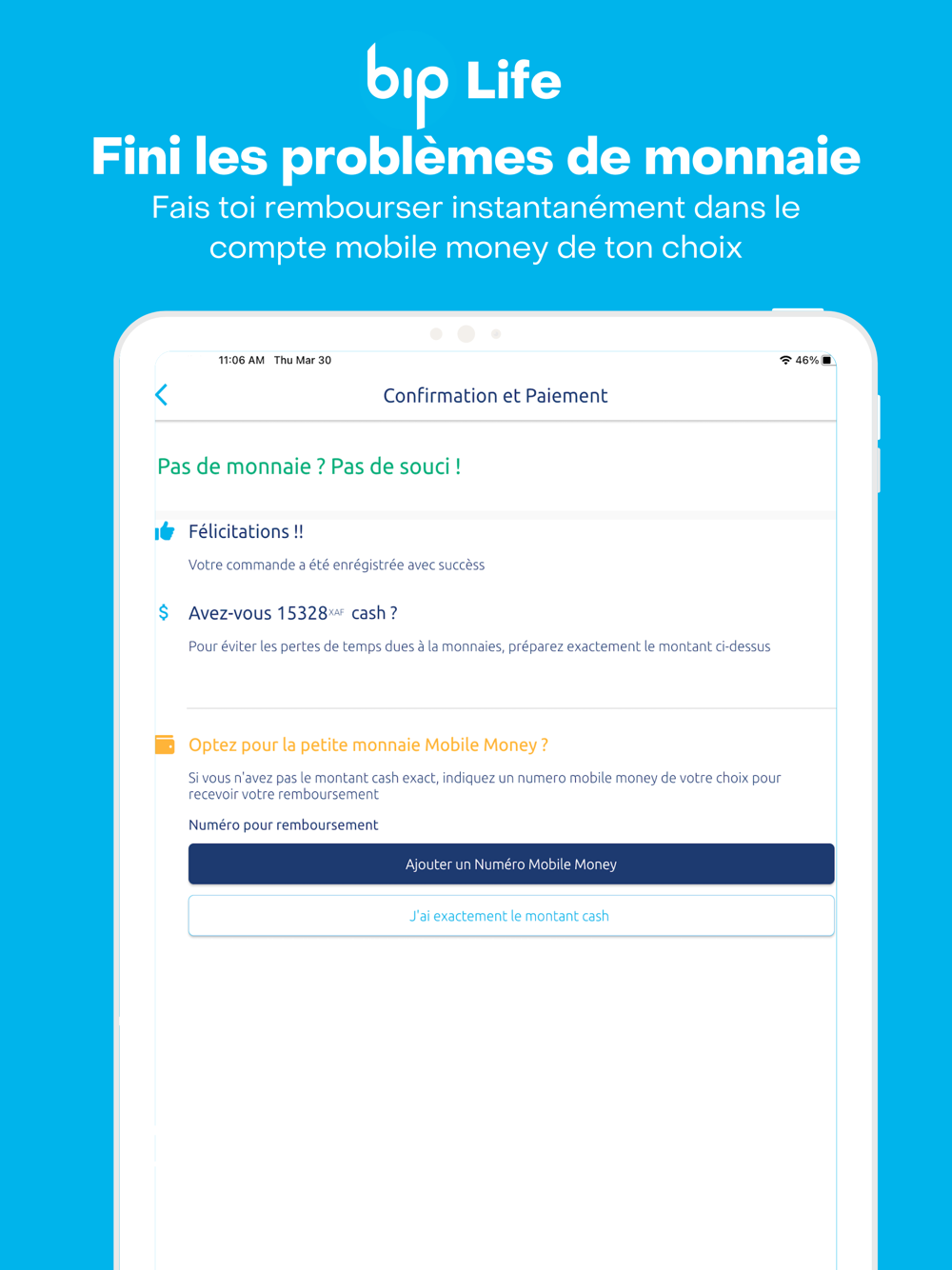 Vous perdez des dizaines de minutes chaque jour à attendre dans les rangs pour la petite monnaie ? N’attendez plus, téléchargez notre application. Payez toutes vos commandes par mobile money ou payer cash à la collecte et recevez instantanément votre PETITE MONNAIE DIGITALE dans le porte-monnaie mobile money de votre choix. Plus besoin de perdre du temps ou de laisser votre petite monnaie dans les supermarché et autre points de vente après des dizaines de minutes d’attente. Si vous le désirez nous pouvons aussi transformer votre petite monnaie en des dons dans les orphelinats ou autre œuvre de charité de votre choix.