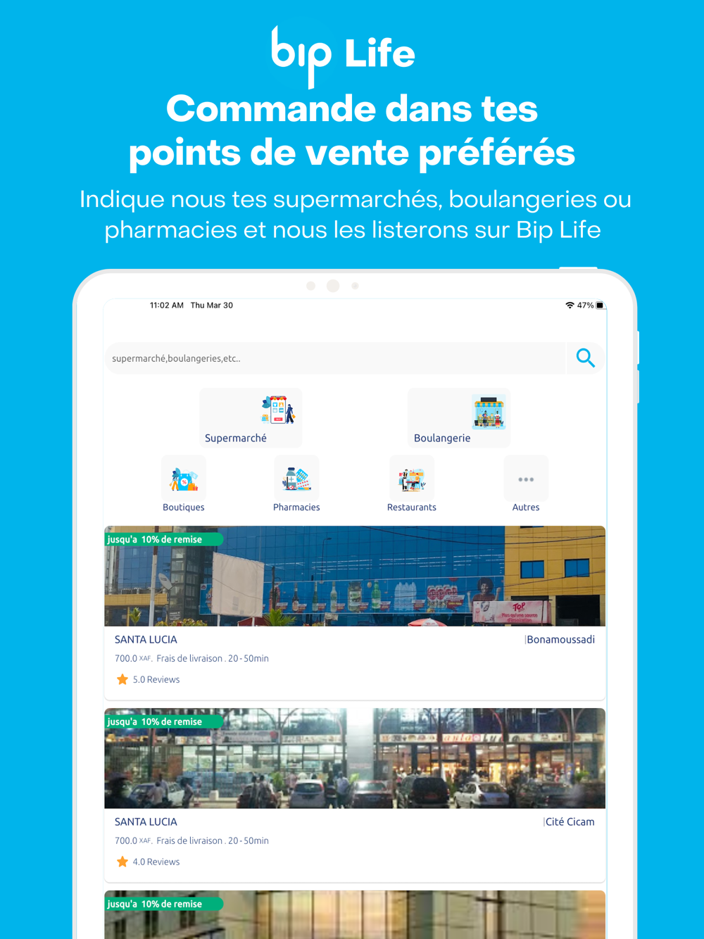 Commandez vos courses en quelques clics dans plusieurs supermarchés, boulangeries, pharmacies et autre point de vente de renom. Rechercher parmi de milliers de produits divers , constituer votre panier, payez cash ou avec mobile money, choisissez de collecter au point de vente ou de vous faire livrer.