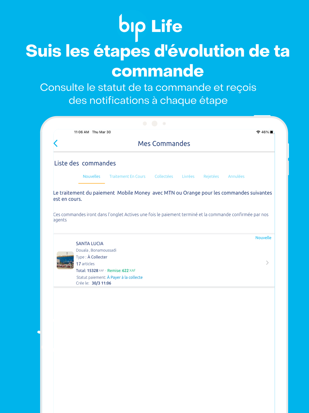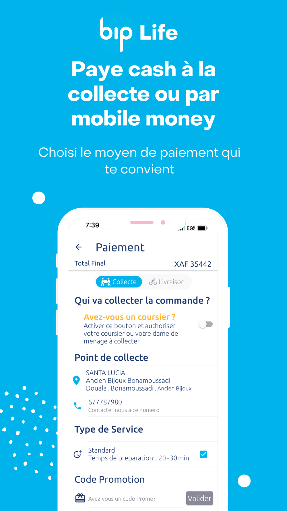 Après une longue journée de travail ou pendant un week-end chargé, vous n’avez pas le temps et la patience de fouiller dans les rayons de supermarché pour trouver les produits dont vous avez besoin ? vous achetez régulièrement certains produits standard et voulez que vos paniers soient préparés pour vous ? Constituer votre panier virtuels et passer une commande de type COLLECTE sur notre application. Nos agents se chargeront d’apprêter un panier réels et bien emballé prêts à être collecté en quelques minutes, à votre convenance, dans le point de vente que vous avez indiqué. Pas de file d’attente pour payer avec tous les autres clients, pas de problème de monnaie à la caisse. Vous pouvez aussi indiquer un coursier de votre choix qui viendra collecter vos achats.