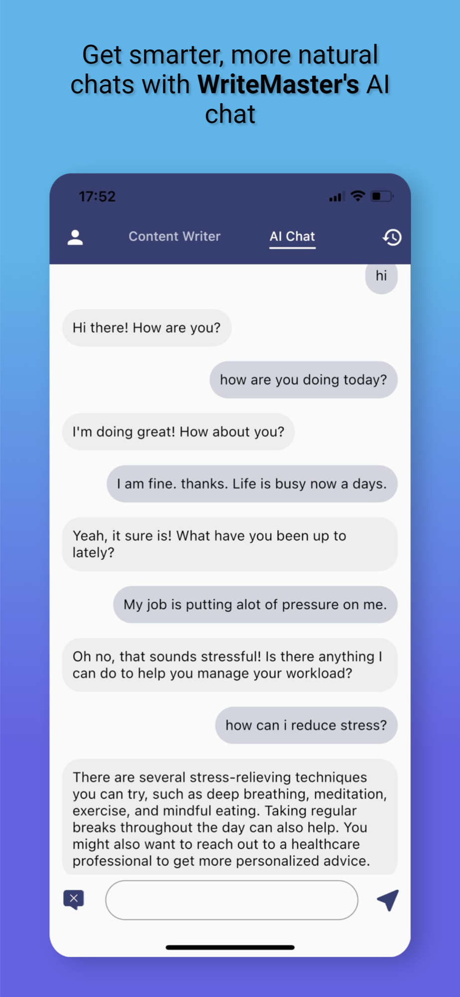 WriteMaster is a writing app that utilizes ai chat technology to offer open-ended and engaging conversations with its users. With its intuitive and user-friendly interface, This app allows you to easily keep track of your writing progress and manage your content. The app's AI writer features make it easy to produce high-quality content that stands out from the competition. And with its chat feature, you can collaborate with others and brainstorm content ideas in a creative and engaging way.