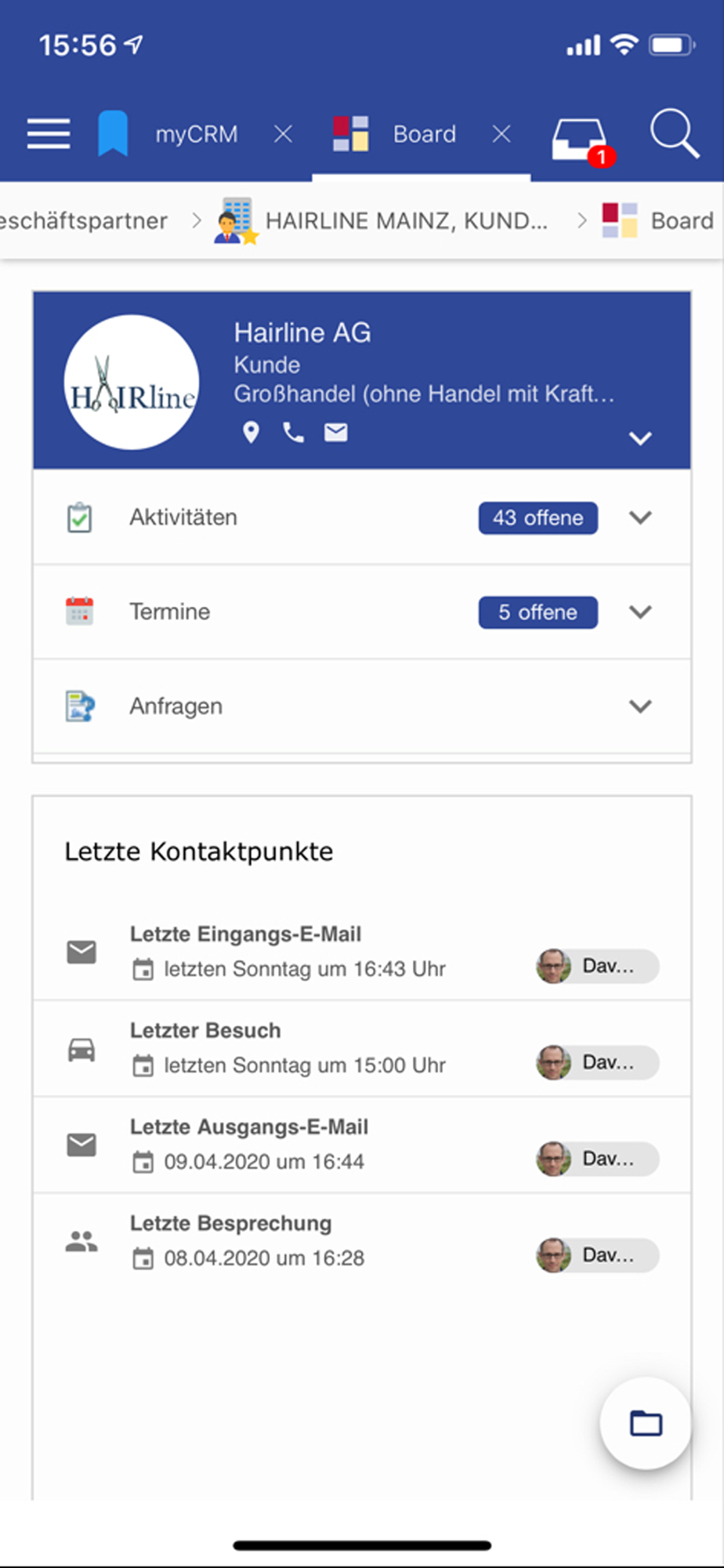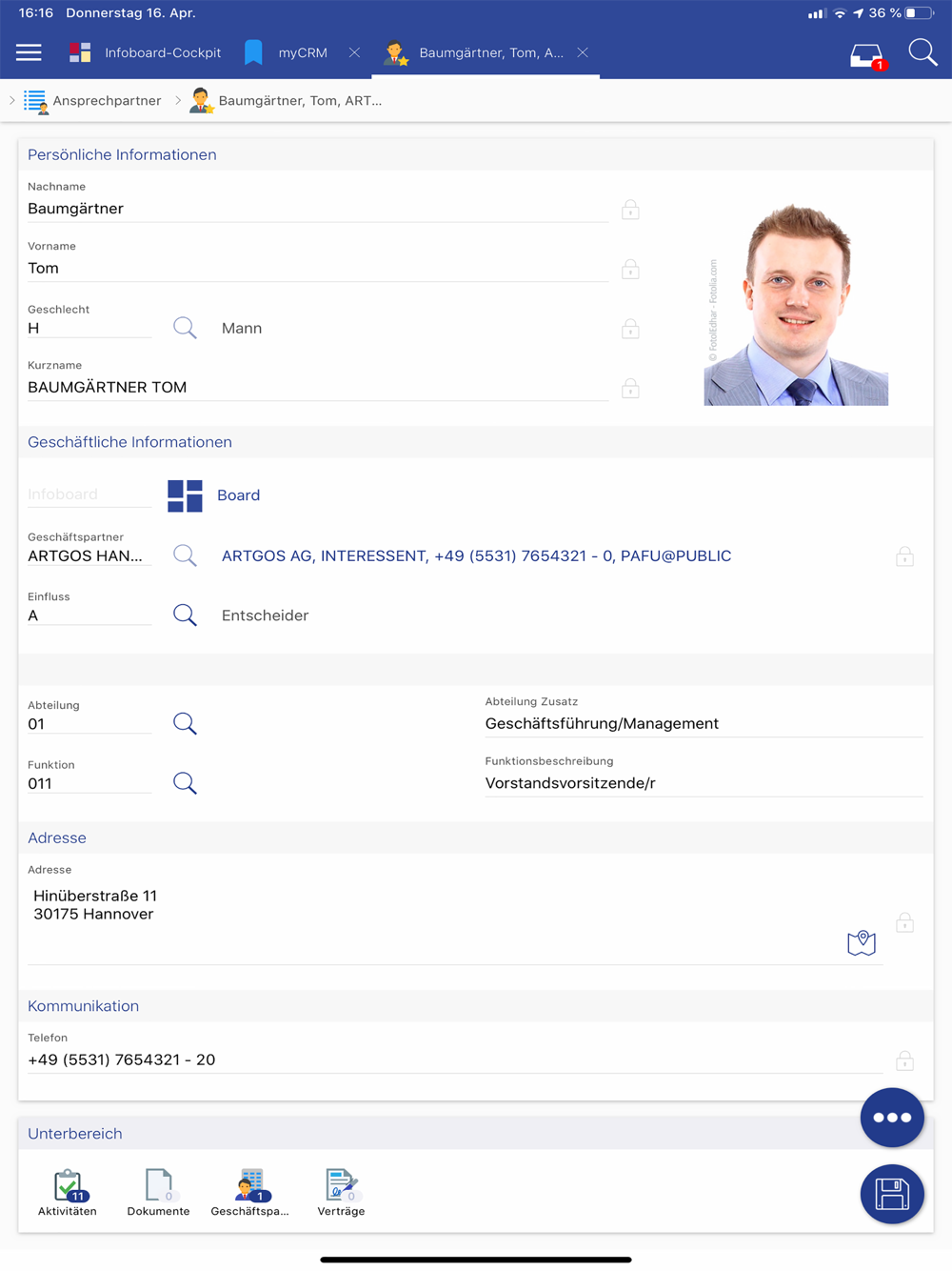 Um die sensiblen Informationen im CRM vor unberechtigten Zugriffen zu schützen, werden diese direkt vom Server abgerufen und nicht lokal gespeichert. Die Konfiguration der mobilen Applikation erfolgt über den Rich-Client. Als weitere Sicherheitsstufe kann zudem Face-ID oder Touch-ID aktiviert werden. Um optimale Datensicherheit zu gewährleisten, stellen wir Ihnen die App gerne auch auf Anfrage zur Verfügung.