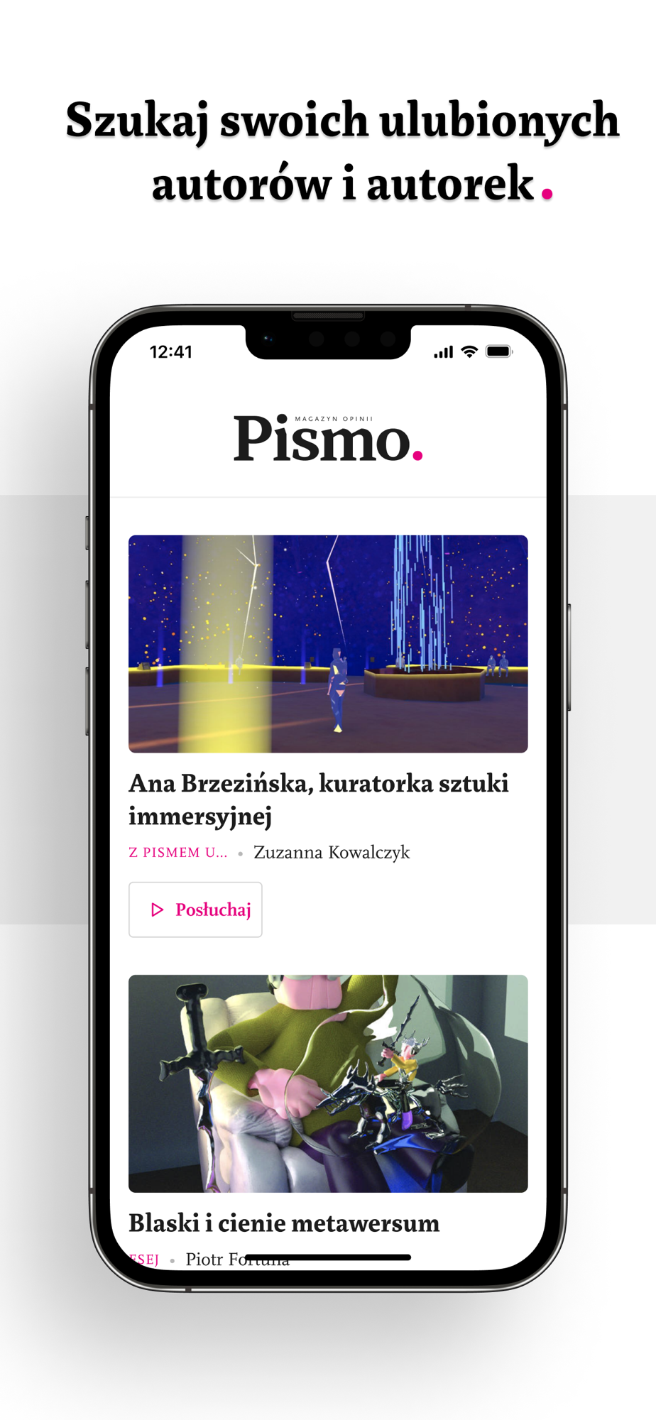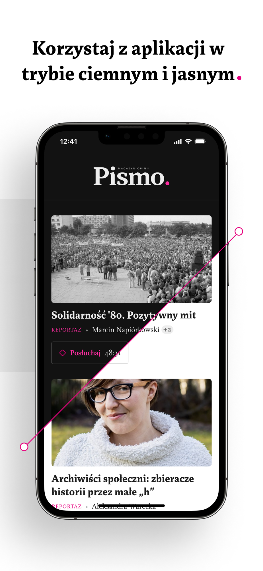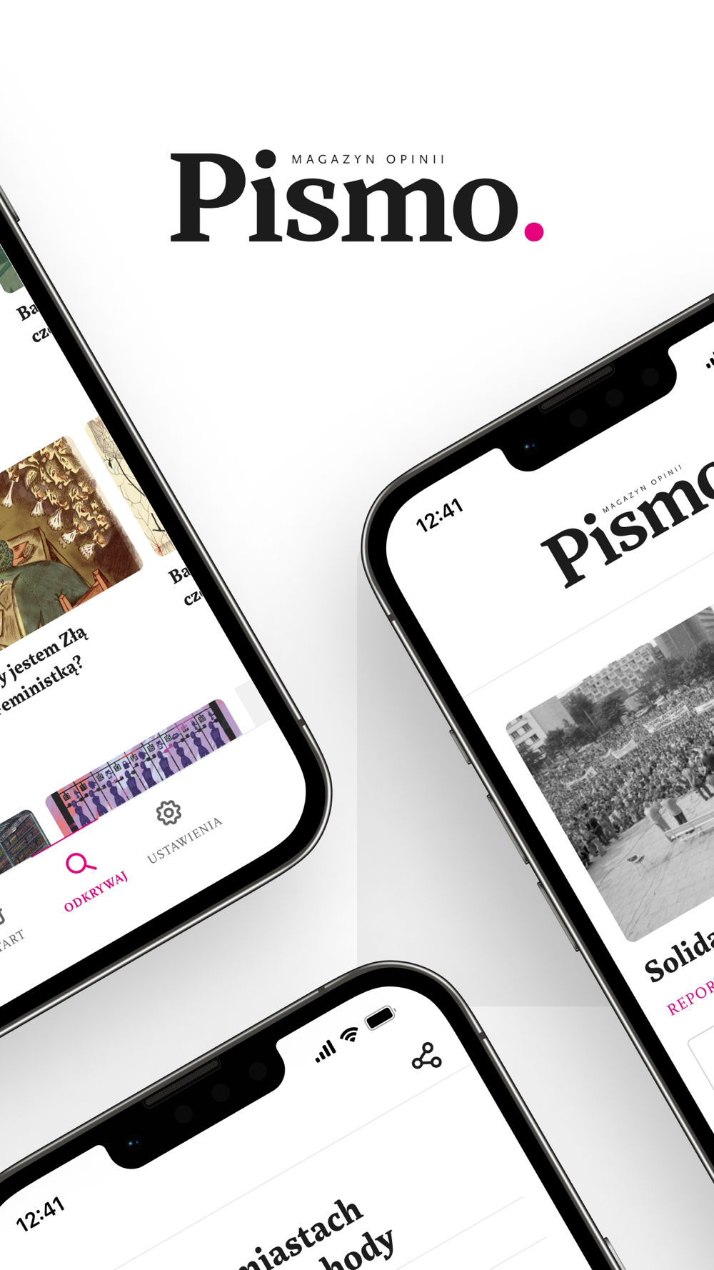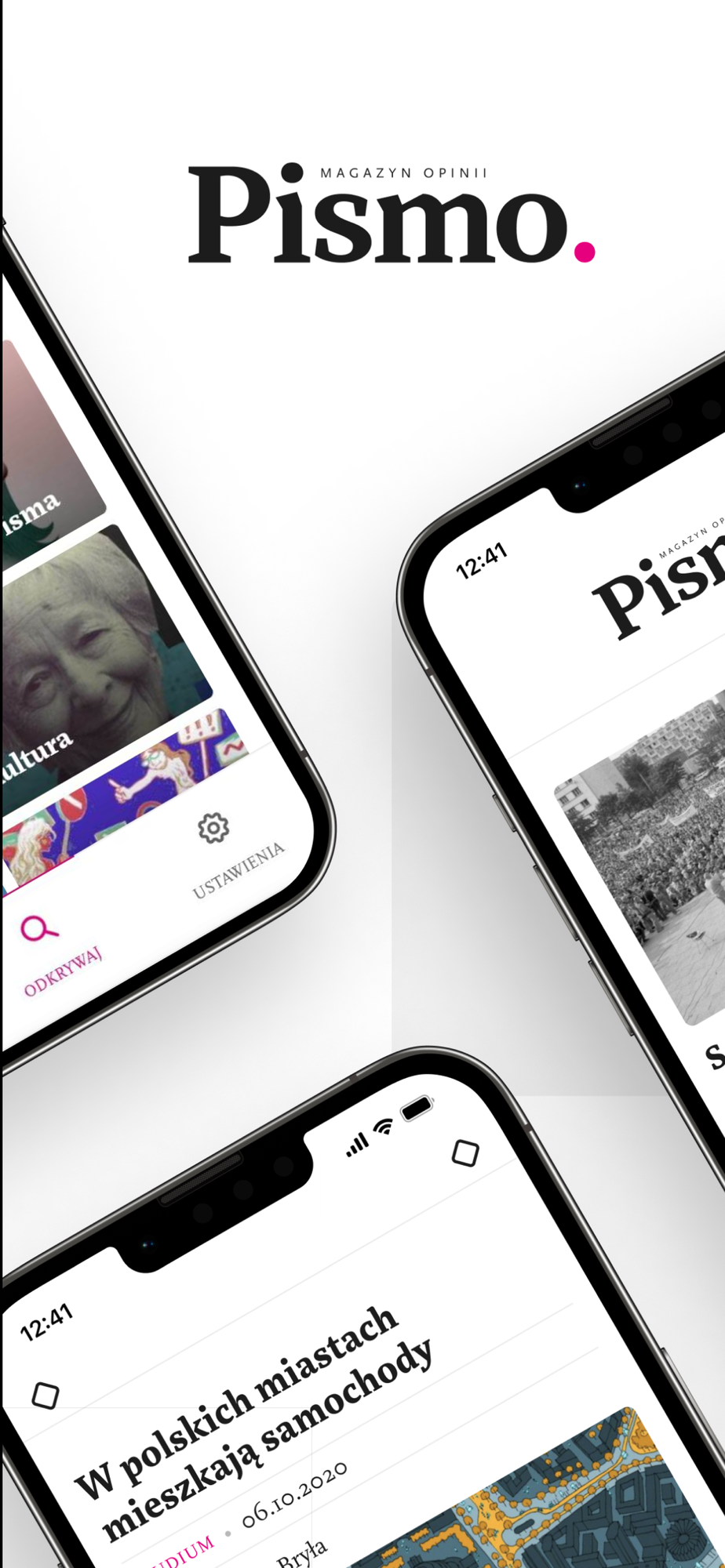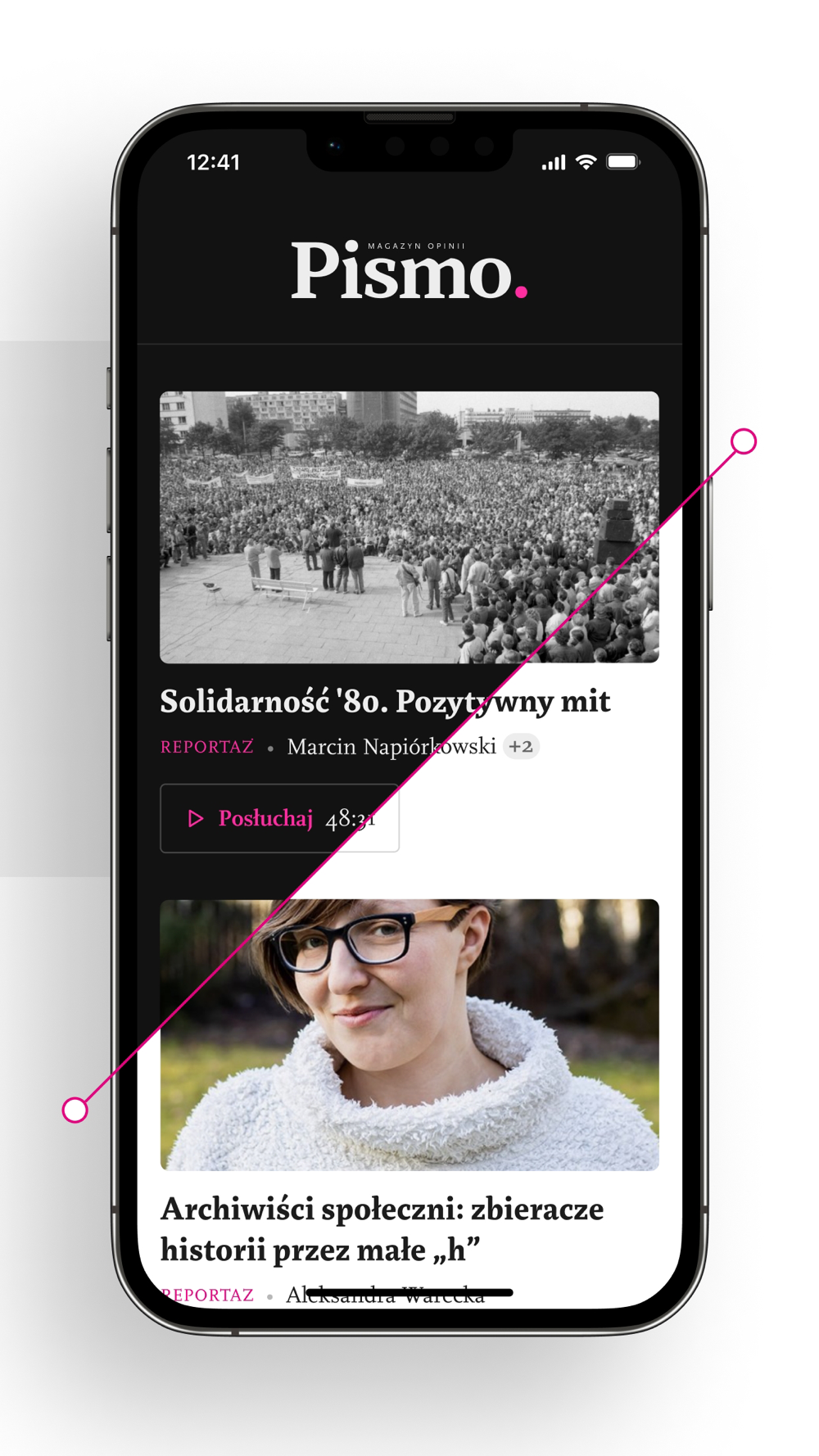 Czytaj i słuchaj materiałów z „Pisma” za pomocą aplikacji. Znajdziesz w niej artykuły z edycji papierowej miesięcznika w dwóch wersjach: cyfrowej i audio. Ponadto wszystkie sezony Śledztwa „Pisma”, podcasty autorstwa: Magdaleny Kicińskiej, Zuzanny Kowalczyk i Barbary Sowy, a także dodatkowe teksty, których nie znajdziesz w papierowym wydaniu magazynu.
