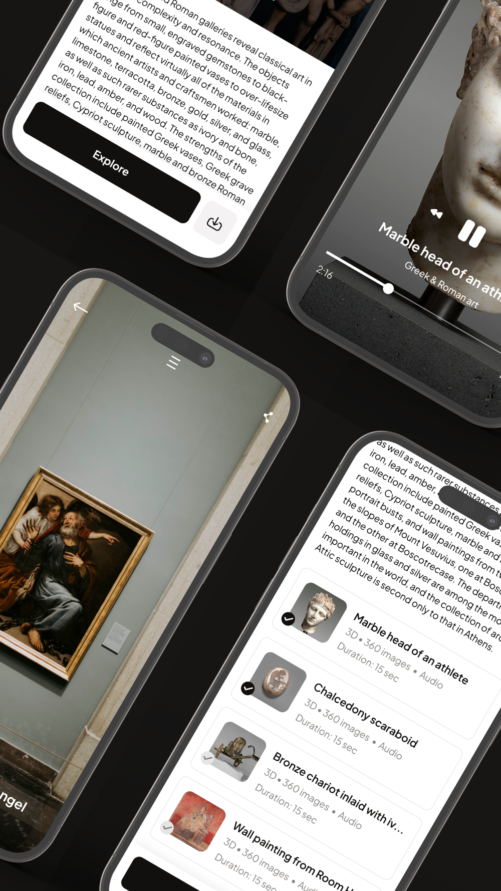 Use all the advantages of immersive technologies to engagement the audience in one application: 3D models, 360 portals, Live Photos, Audio, Video and interactive exhibition Audioguides.