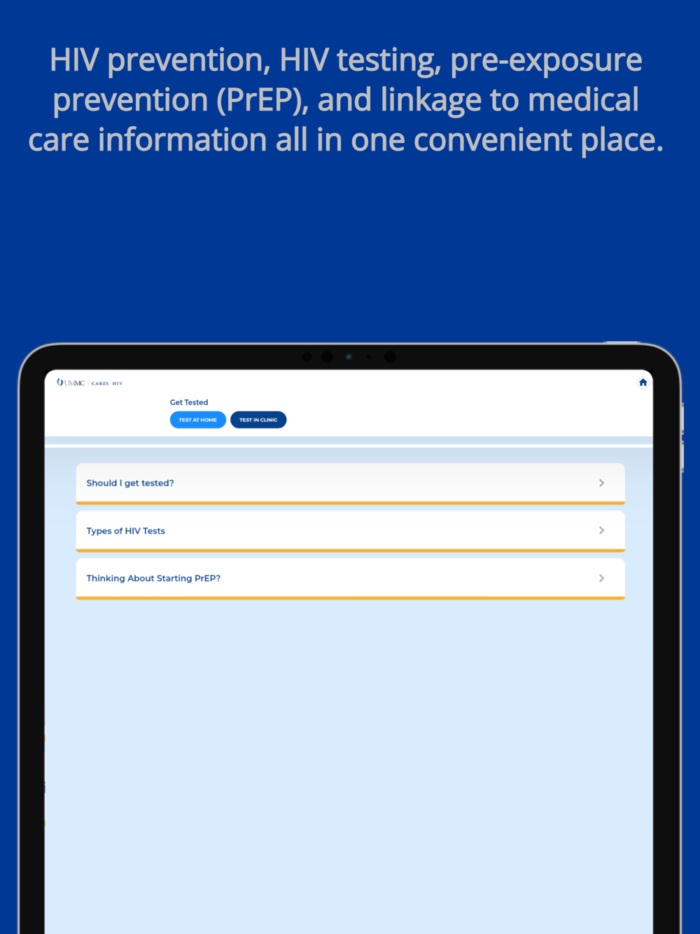 HIV Cares app features HIV prevention and care tools for people living with or at risk for HIV infection. This app provides essential information for HIV prevention, HIV testing, pre-exposure prevention (PrEP), and linkage to medical care.