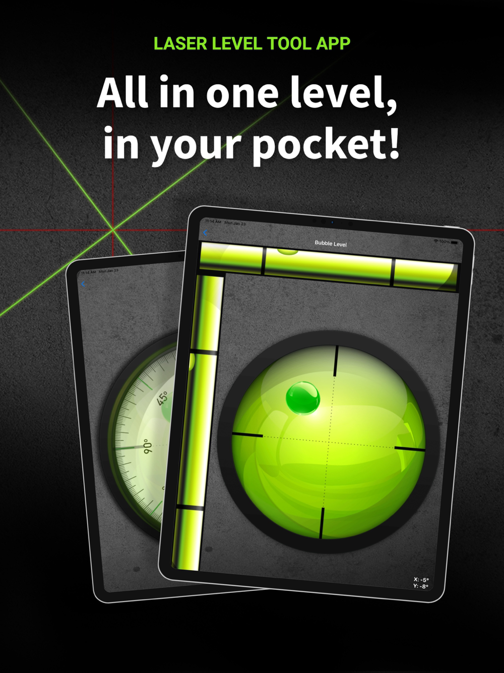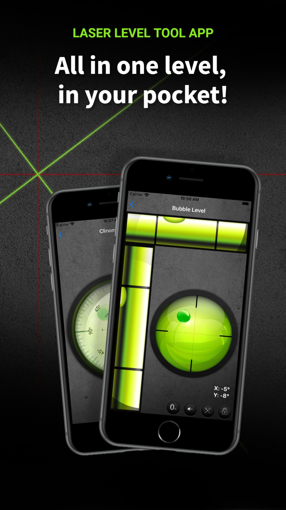 Simply turn on the app and use the onscreen lasers to calibrate any surface you need leveled. Take a photo of your measurements, re-calibrate the lasers as you see fit with the push of a button, share measurements with friends and colleagues.