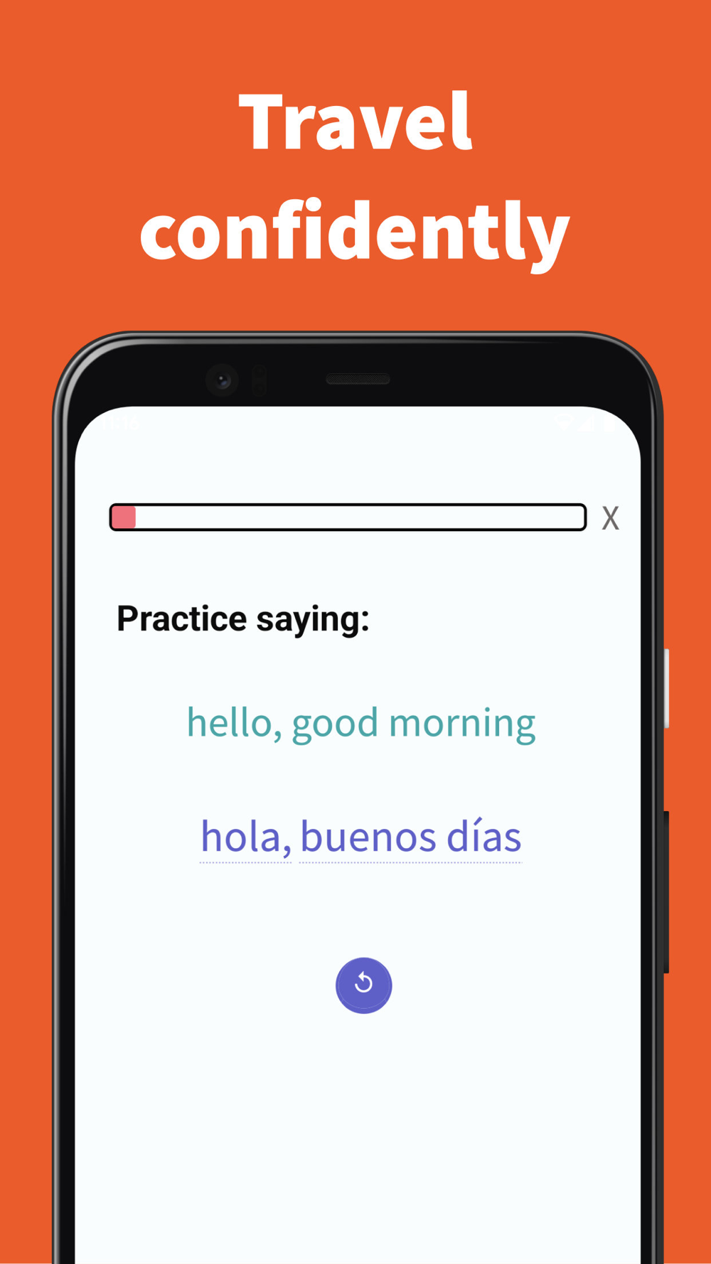 Each lesson focuses on learning one essential travel phrase, such as "Hello, good morning," "Excuse me, I need a menu please," or "What time is the next bus?". Fun quizzes help you build your vocabulary, and our open learning path lets you decide what you want to learn next. GoGab also teaches you how to react to responses you'll get from locals to your questions, and what phrases to use in different travel situations.
