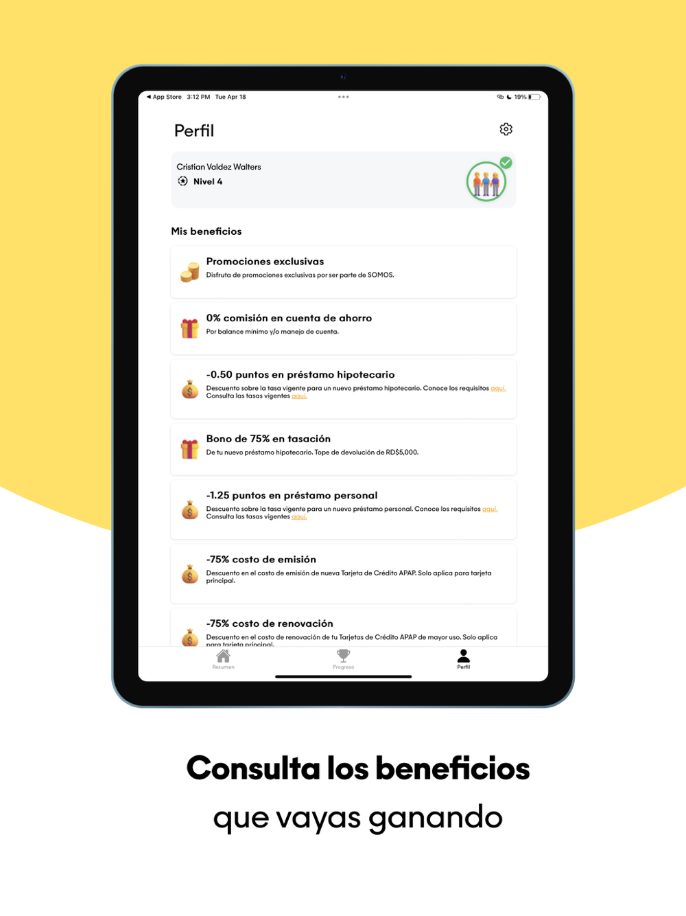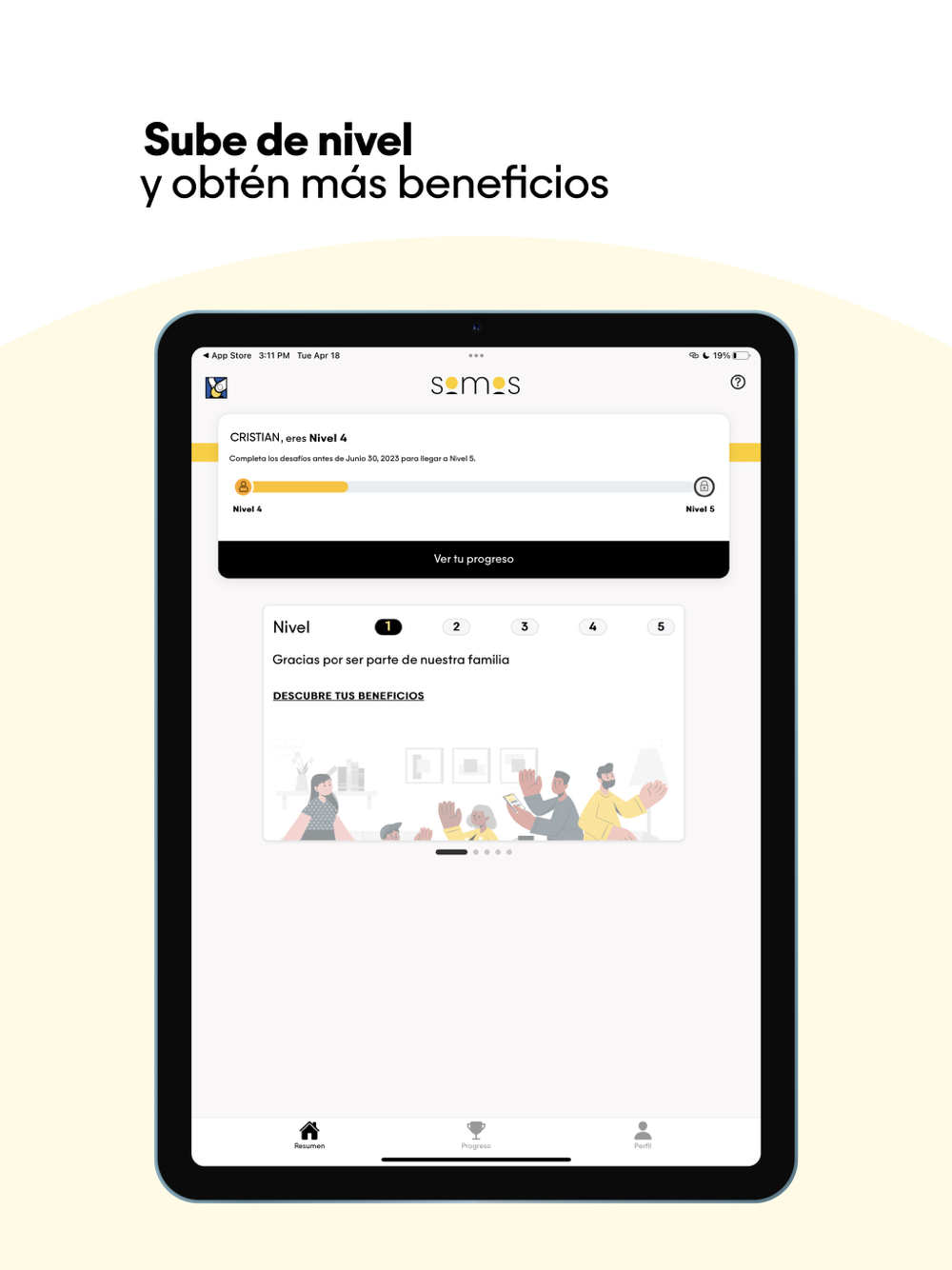 La aplicación te informa sobre tu relación con APAP a través de niveles, que podrás alcanzar y mantener al cumplir con los objetivos definidos para cada uno.