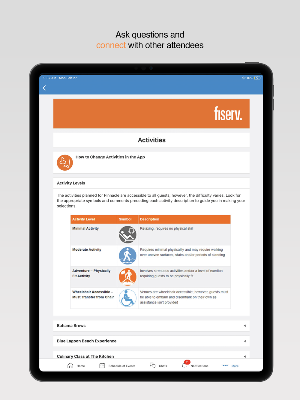 The Fiserv Pinnacle App provides important program information for you to easily reference, such as attendees, schedule of events, activities, attire and more.
