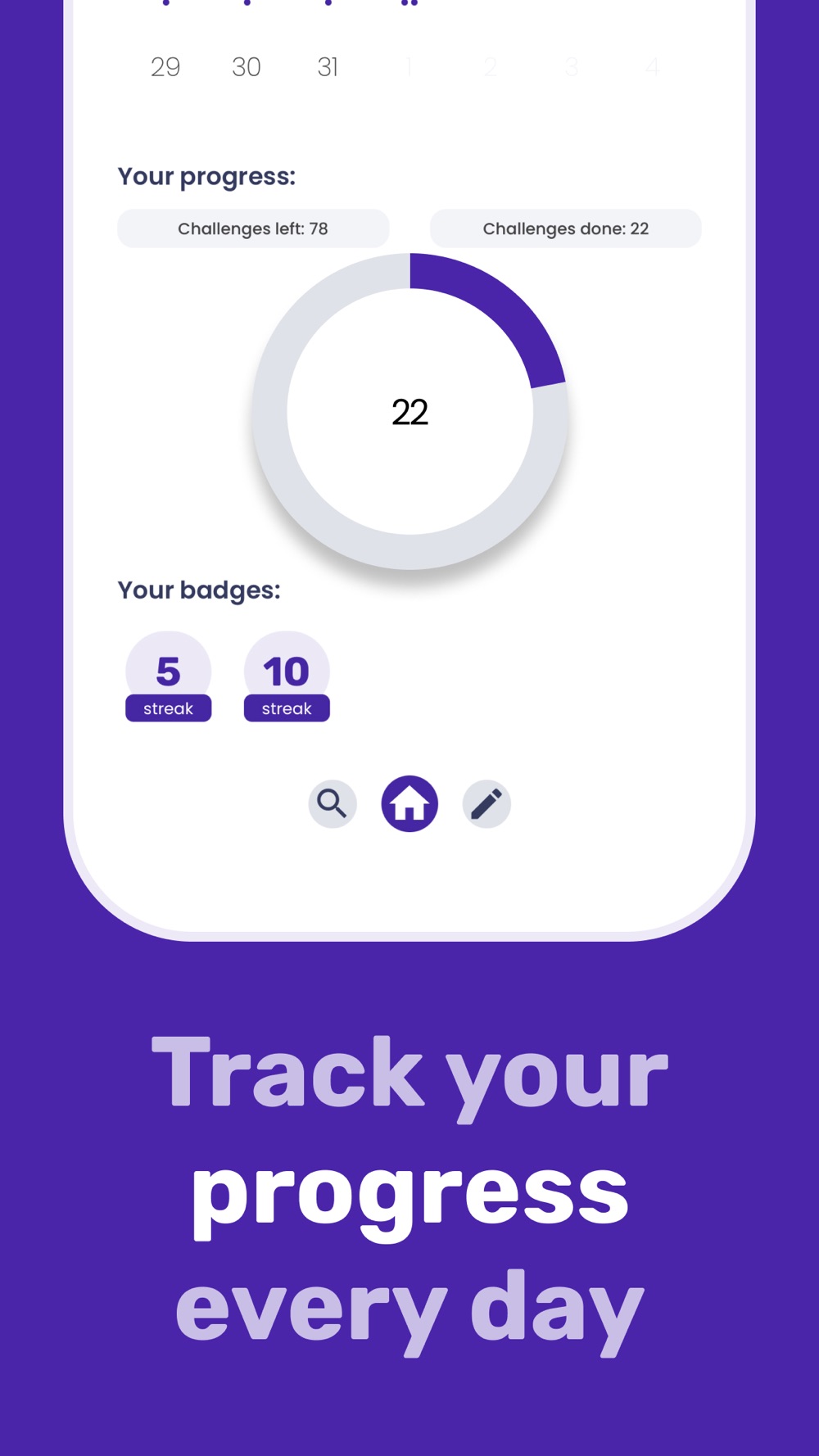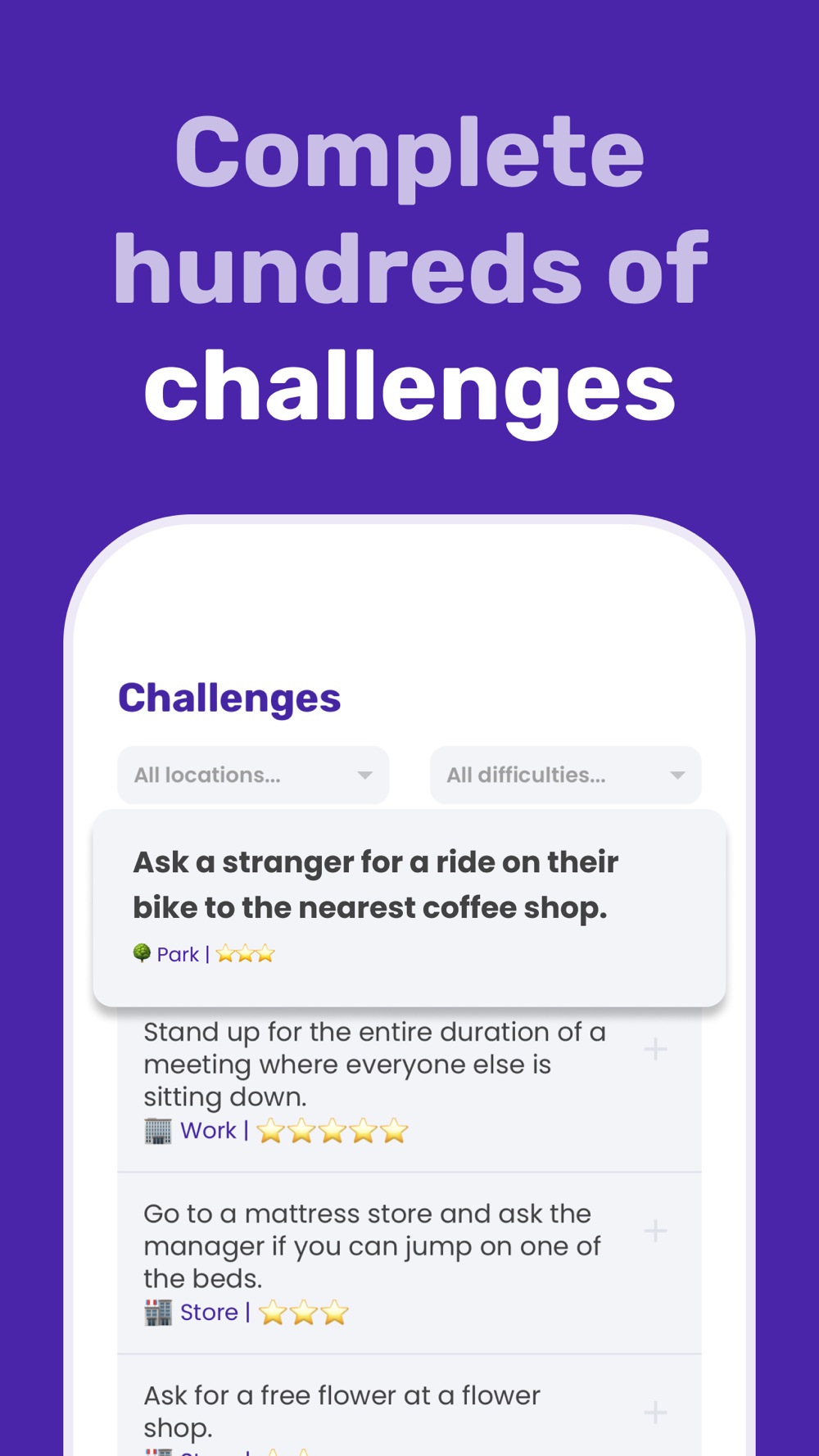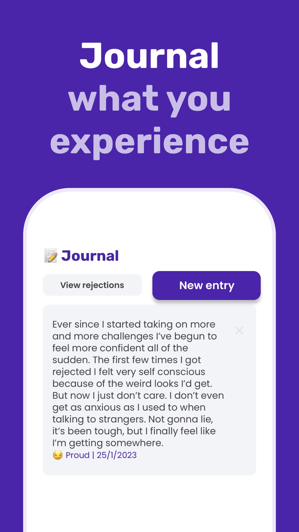 Battle your fear of rejection with hundreds of different challenges. Create your own challenges and earn badges as you make progress. And document your journey as you become a more confident human being with a personal journal.