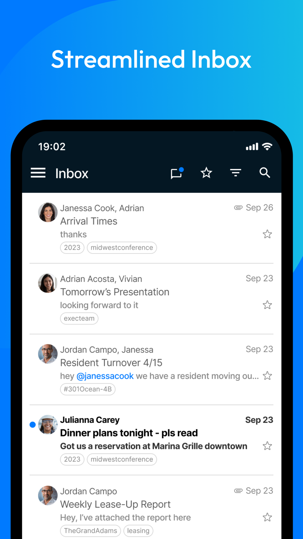 Groups power communication around properties, projects, and topics. They are easy to create and simple to use. Tags organize and label communications in a standardized way. When one team member tags a conversation with a property, unit, project, etc., it’s labeled for everyone.