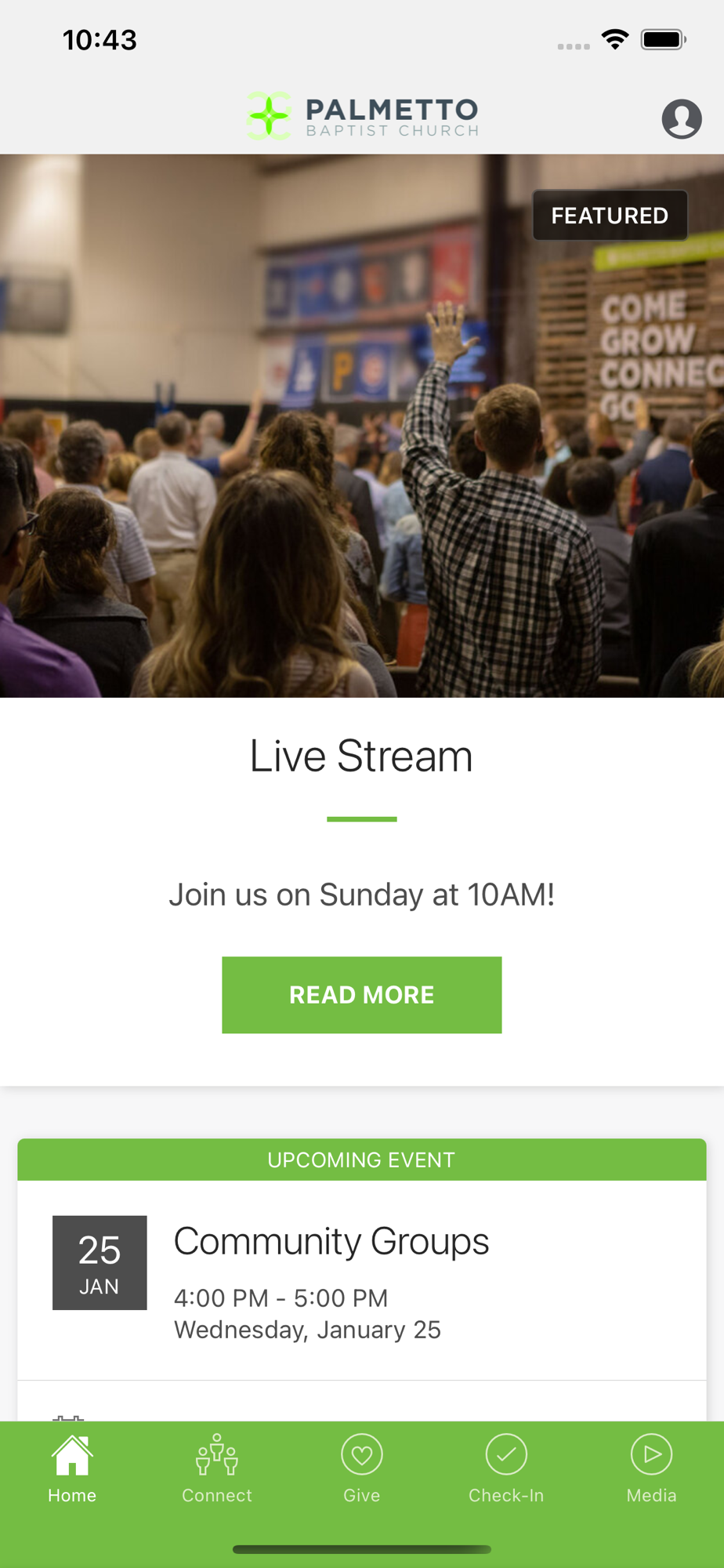 Connect and engage with the Palmetto Baptist Church app! You will be able to view upcoming events, give, read the bible, and more!