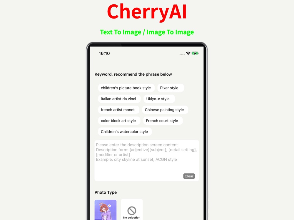 Choose your photo, describe or check the style you want, CherryAI can help you generate
