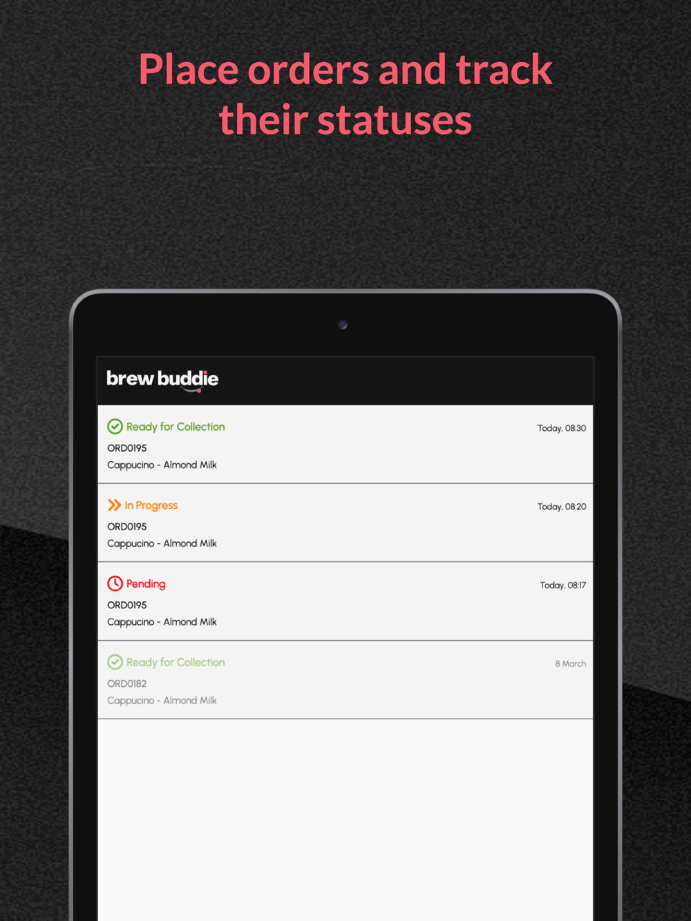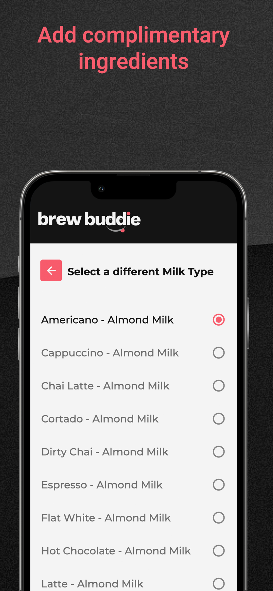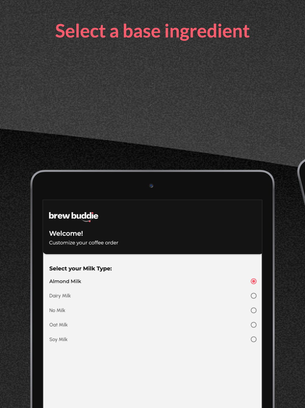 The BrewBuddie Customer App is where the customer or user will go to place their orders. Here’s how it works. Firstly download the app and create your account as a customer. Once you have made your account, you will use these details to log in. Once logged in, customize your order by choosing the base ingredient. This is followed by a second step containing a set of options complementing the base ingredient. If you are happy with your selection, the order will be placed and sent through to the Barista App for the Barista to begin processing your order. You’ll be notified when your order has a change in status.