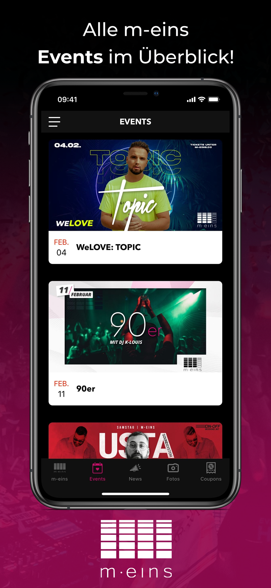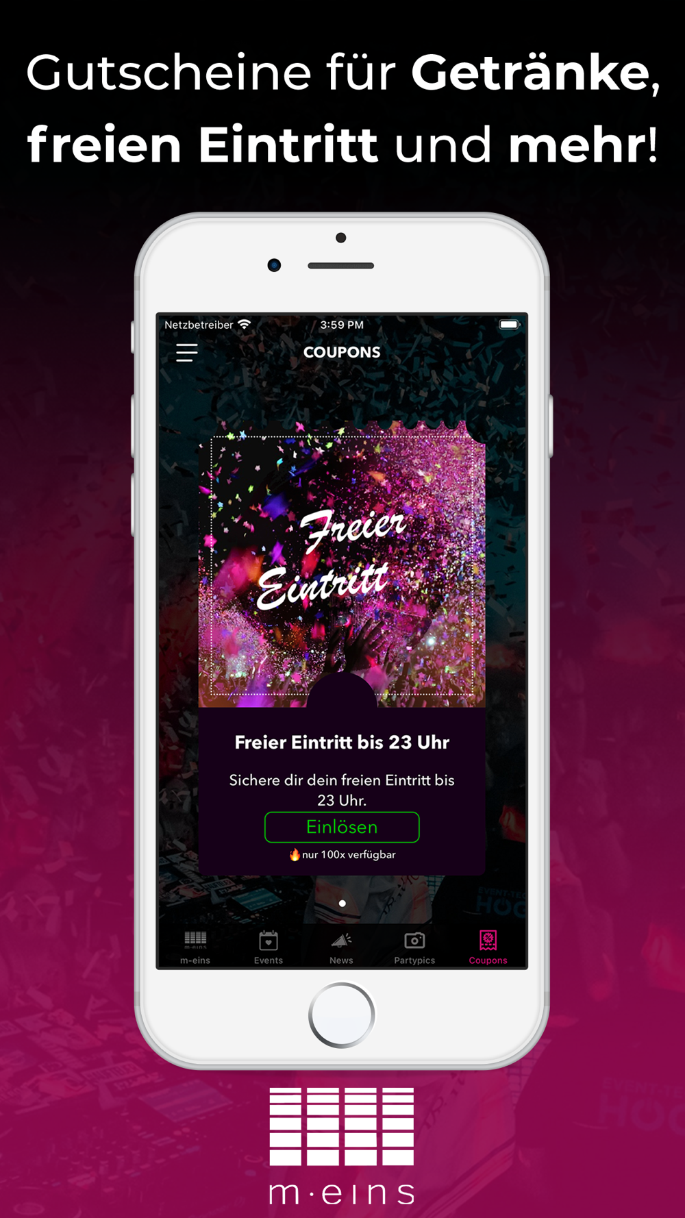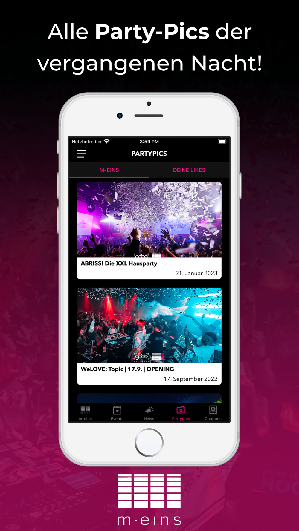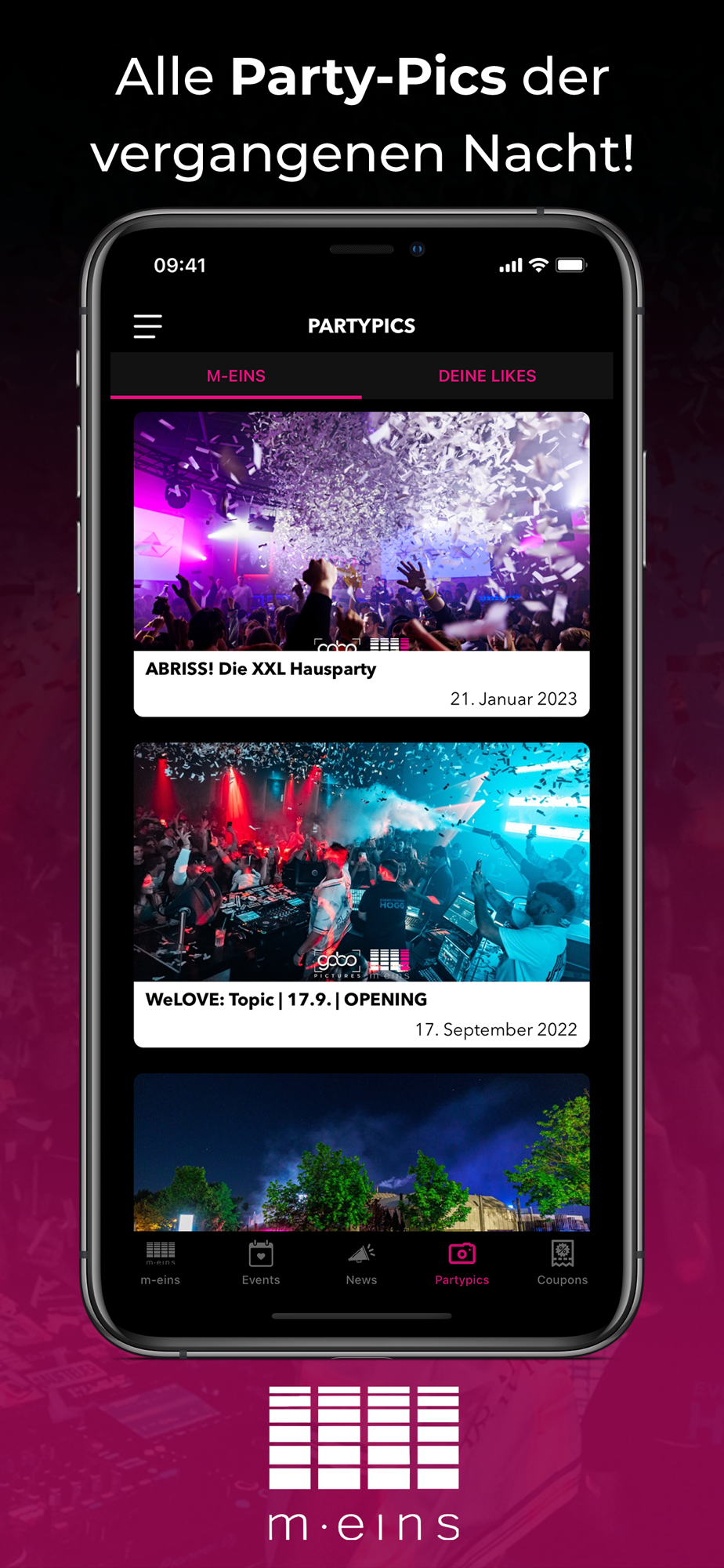 Du erfährst als erster, wann die nächste Party steigt und profitierst dabei noch von fetten Aktionen. Zum Event sparst du mit unseren Gutscheinen bares Geld. Damit du dich am Tag danach auch an den geilen Abend erinnern kannst, stellen wir alle Party-Pics in der App bereit.