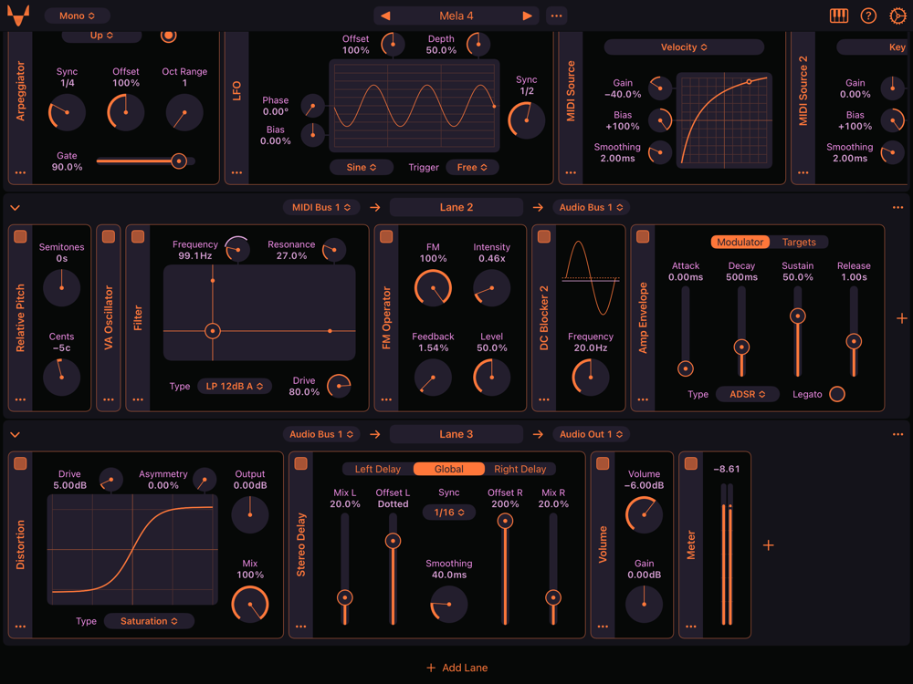 A Mela preset is made up of ordered modules arranged on lanes that process audio and MIDI signals. Each lane can receive and send signals to and from the host or other lanes using buses. The modulator modules can modulate any parameter of any module on any lane. The lanes and modules can be easily added, removed or rearranged making the preset as complex or as simple as desired. Mela comes with 52 modules, with new ones added with every update. The following are some examples from different categories.