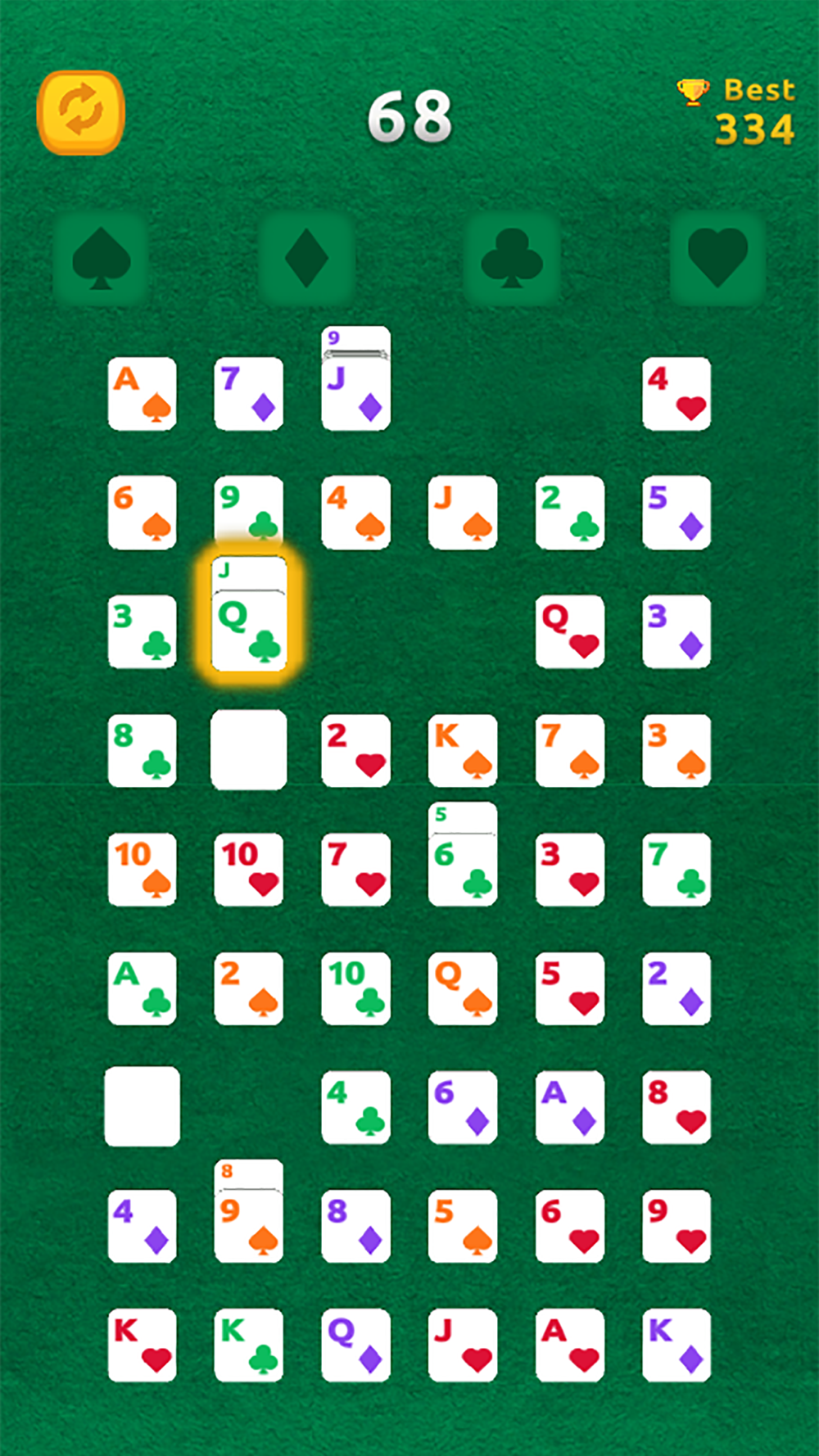 Play the famous Solitaire in a new way! Stack all the cards of the same color in the right order and finish the whole grid!