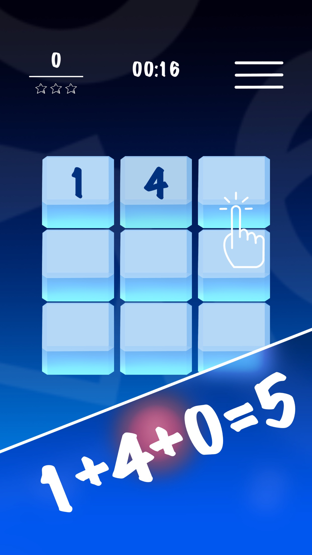 • Tap buttons to place numbers on them. When numbers in a column, row or diagonal cells add up to 5 (1, 1, 3 or 3, 2, 0) on the number grid, the cells gets cleared up.