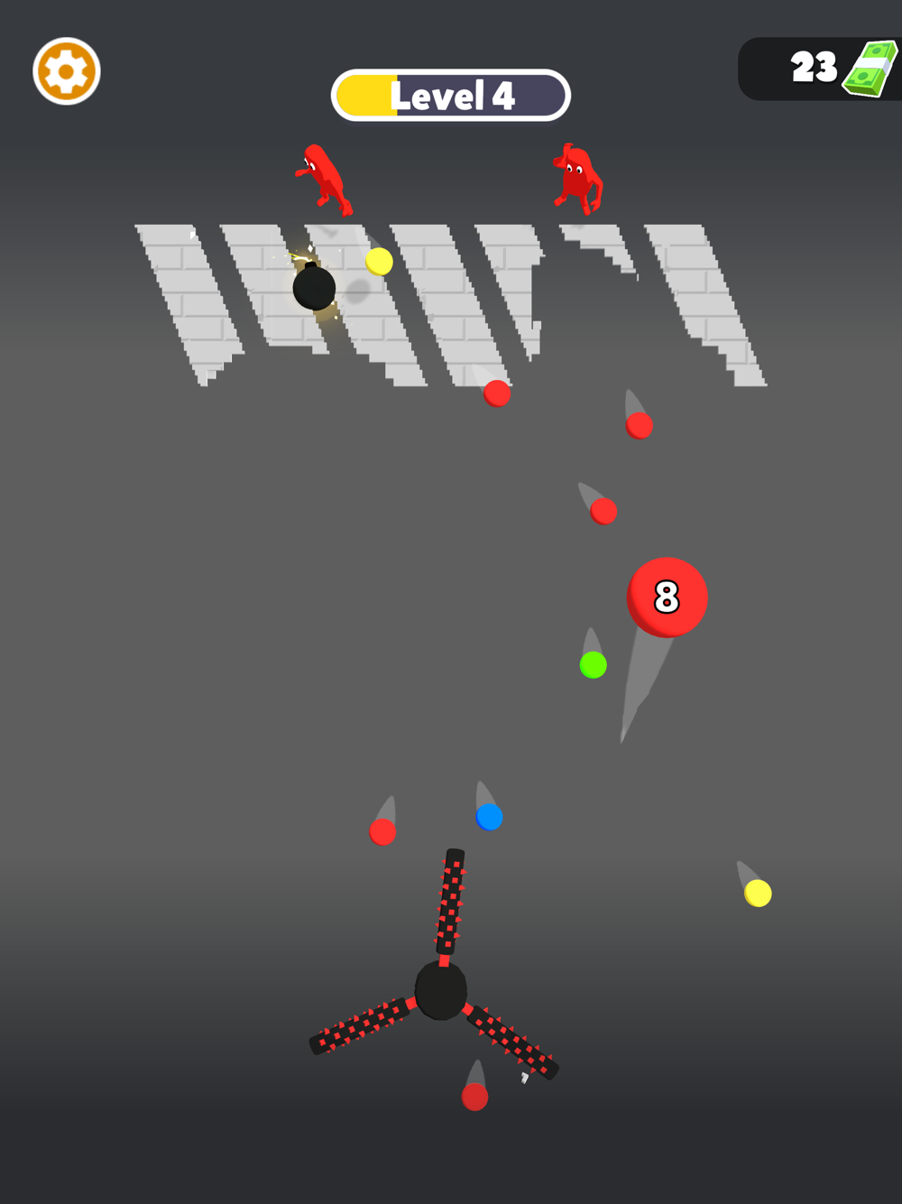 Collect balls of the same color to break more walls and make a shot. Avoid obstacles and collect features.