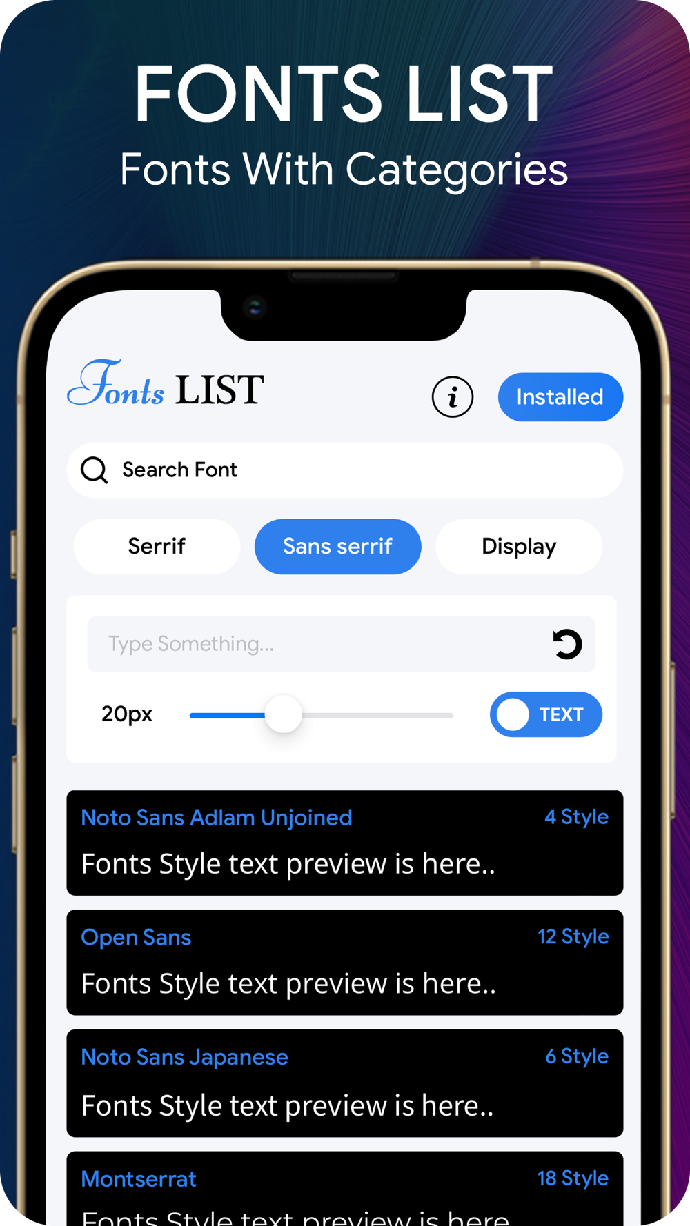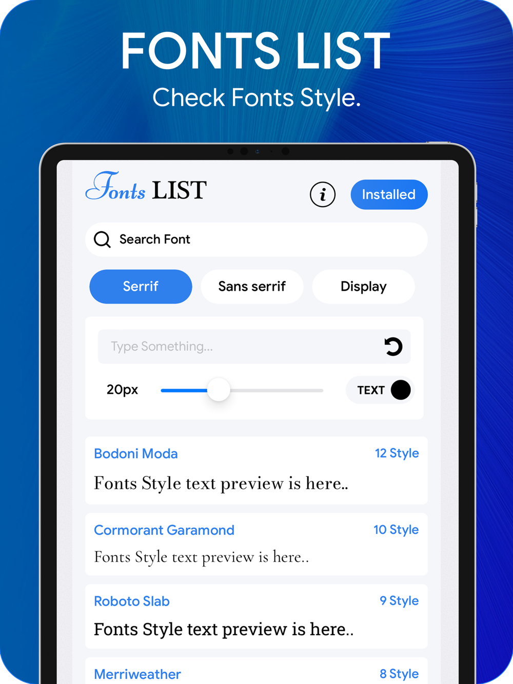 Font Installer is here to offer you a wide variety of well-known and lesser-known fonts to use with your favorite apps directly on your iPhone.