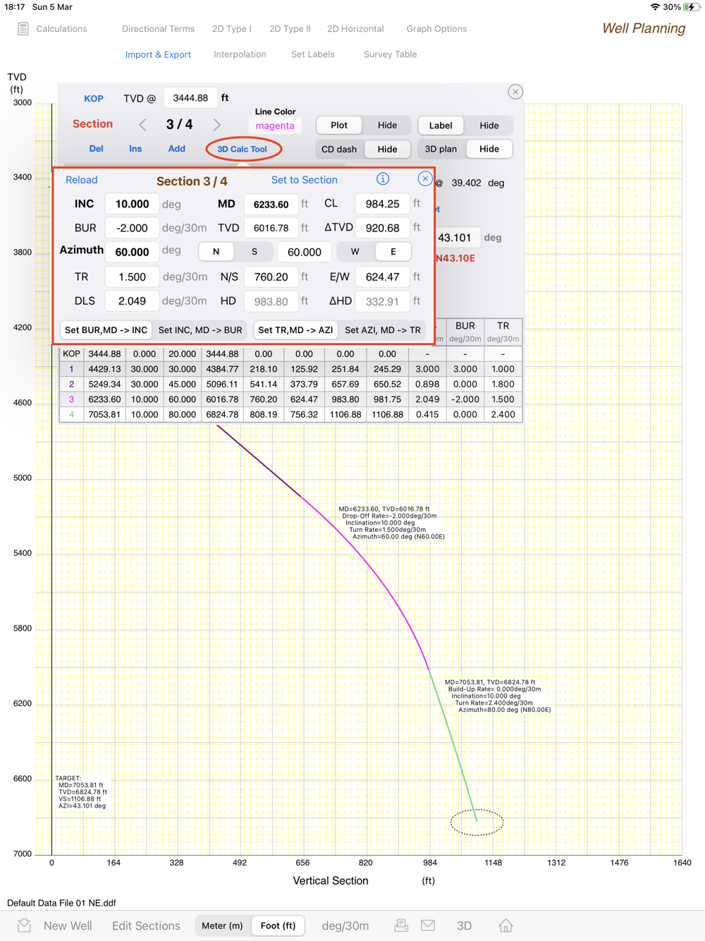 2. Easy 3D calculation tool for well planning with up to 20 multiple 2D and 3D sections (using Minimum Curvature method)