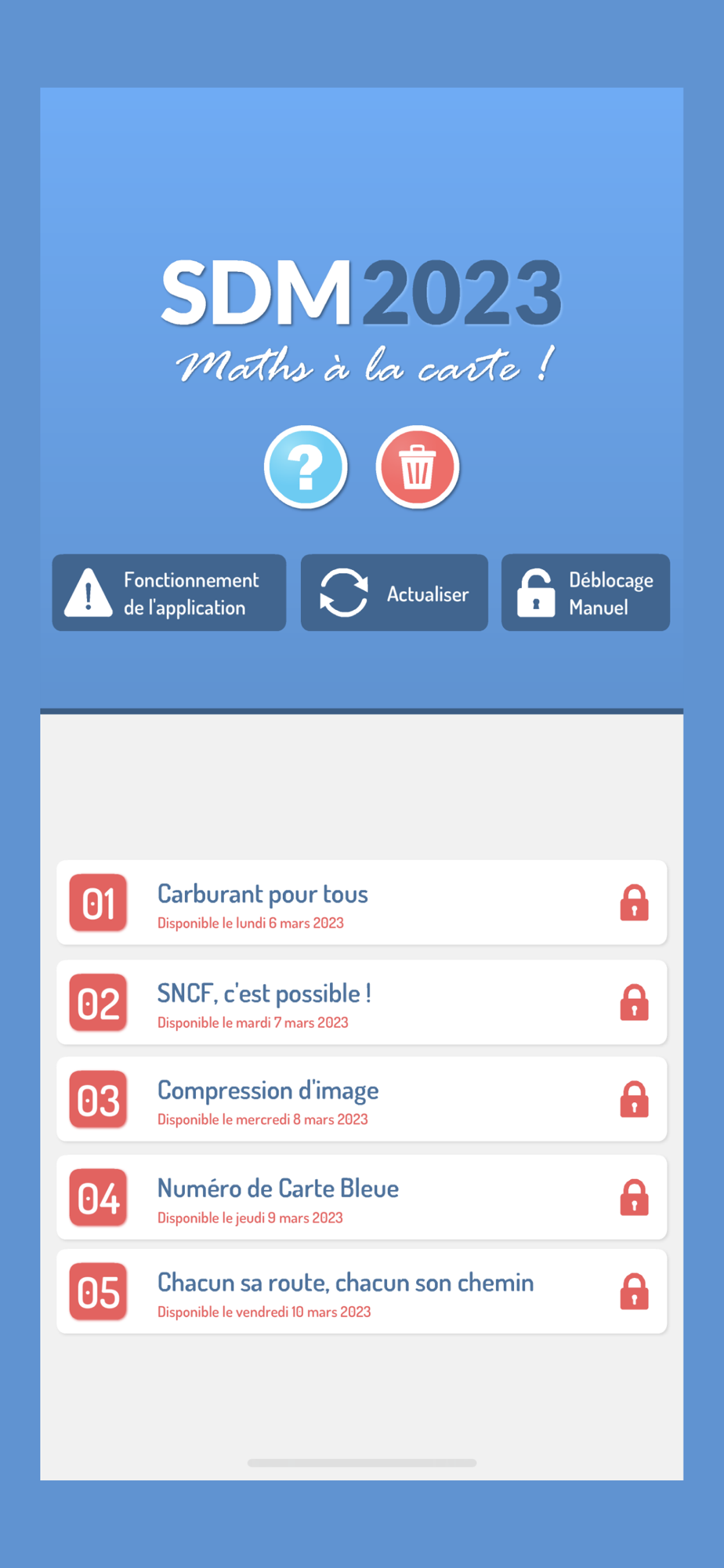 L'application SDM 2023 est destinée à être utilisée dans un établissement scolaire (école primaire ou collège) dans le cadre de la semaine des mathématiques. Elle permet la mise en place d'un concours d'énigmes, sous la supervision d'un enseignant référent qui collecte les réponses et établit un (ou plusieurs) classements.