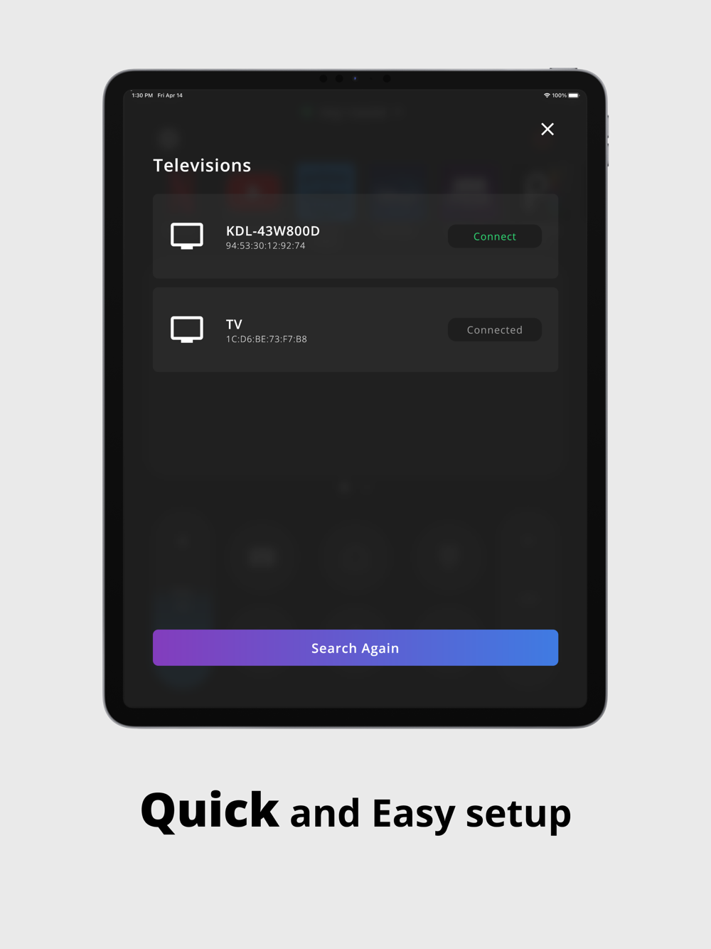 Connect your phone/tablet to the same WiFi network as your TV device for the application to work.