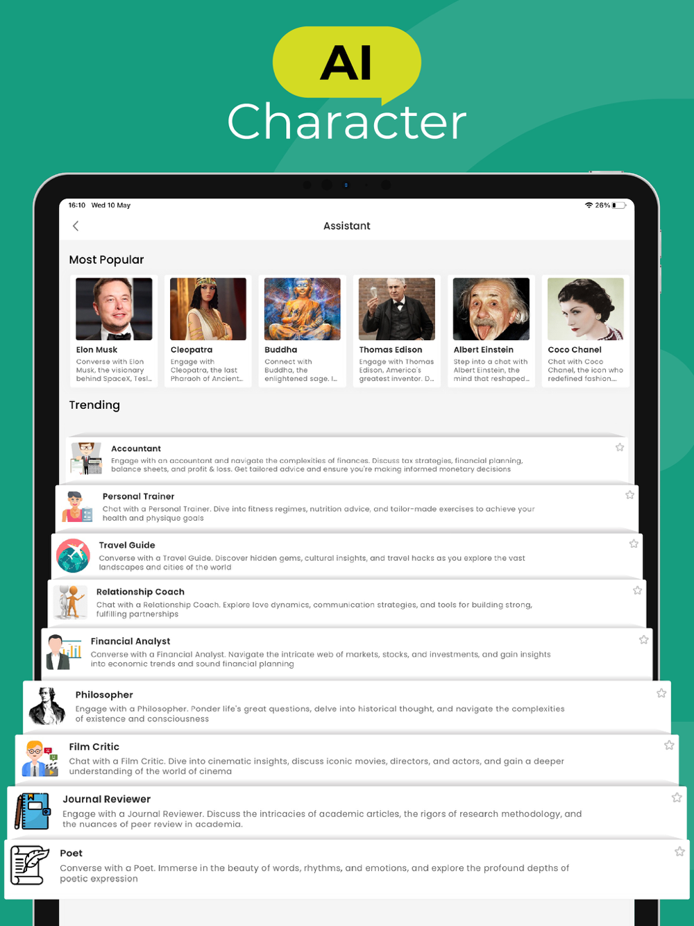 - AI Characters: Journey through history by conversing with figures like Edison, Buddha, Cleopatra, and contemporary icons like Elon Musk.