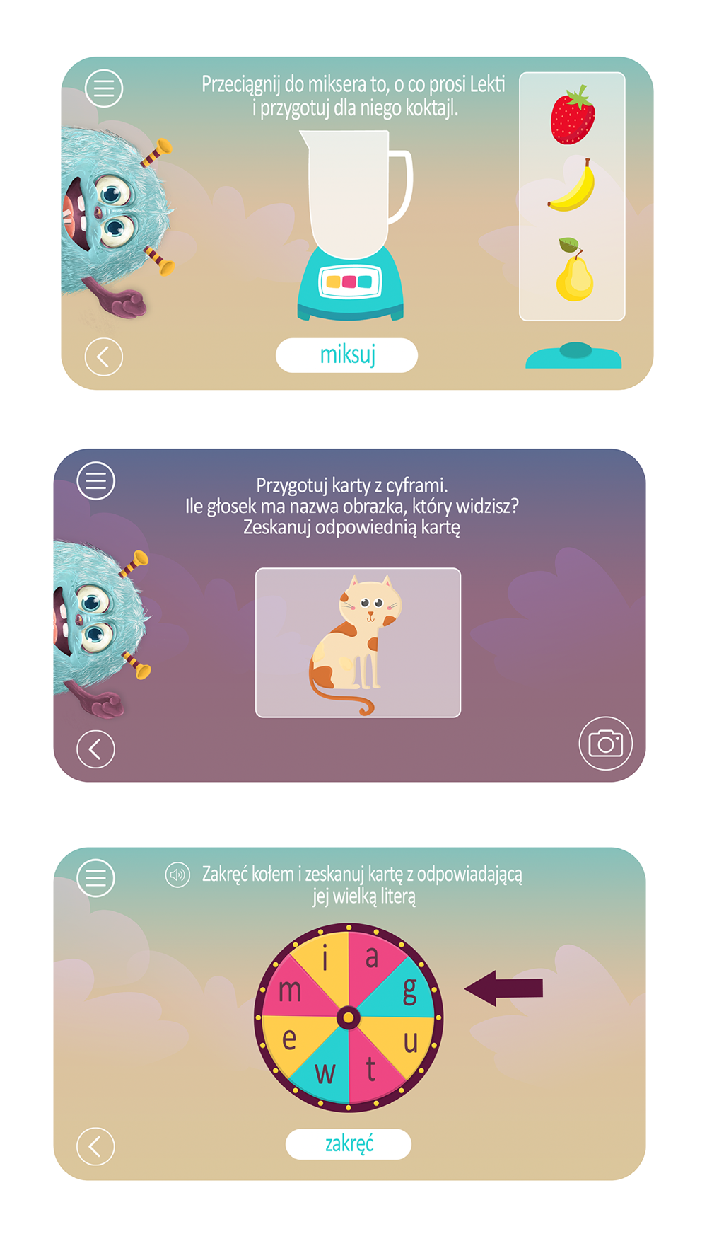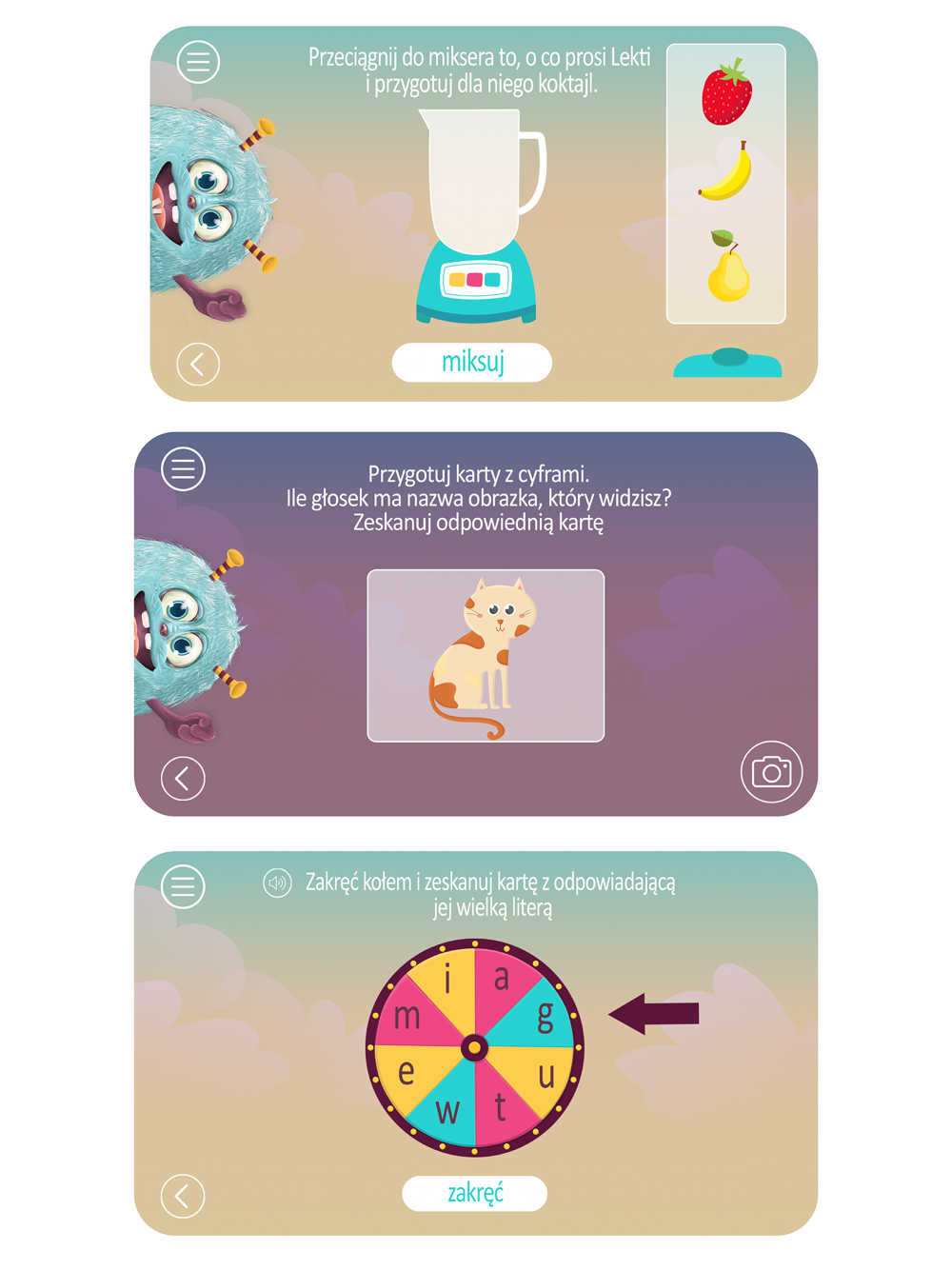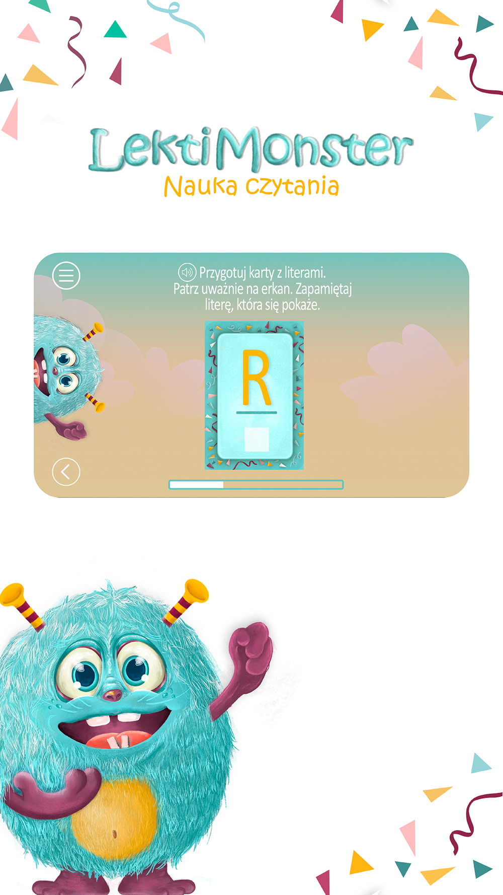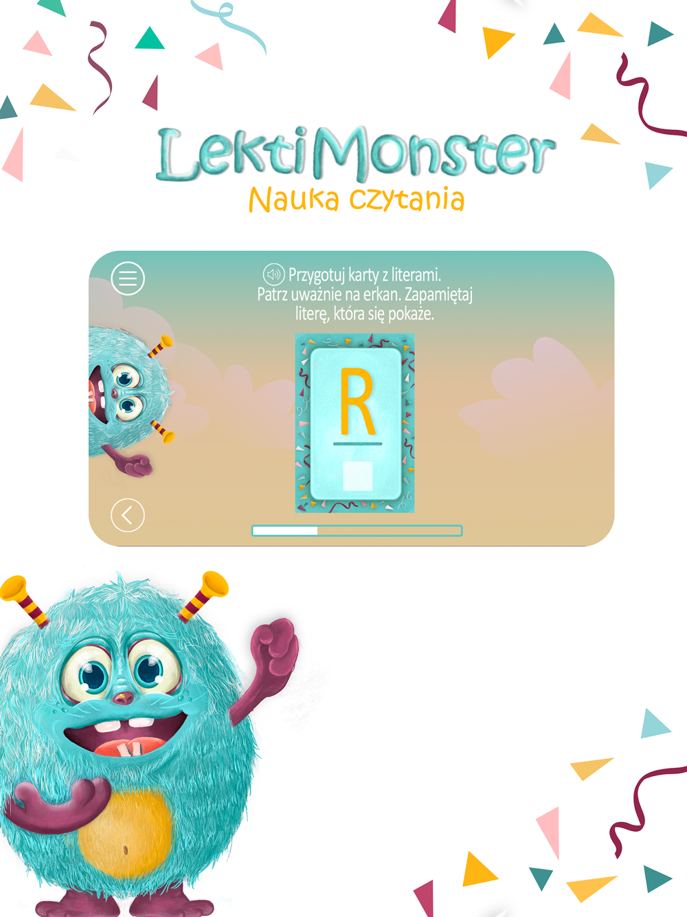 Lekti to przyjazny stworek, który planuje swoje przyjęcie urodzinowe. Bohaterowi brakuje dekoracji, smakołyków i atrakcji dla gości. Pomóż mu w przygotowaniach, w tym celu wykonaj wszystkie zadania. Dzięki zabawie z Lektim poznasz litery i dowiesz się jakie dźwięki oznaczają.