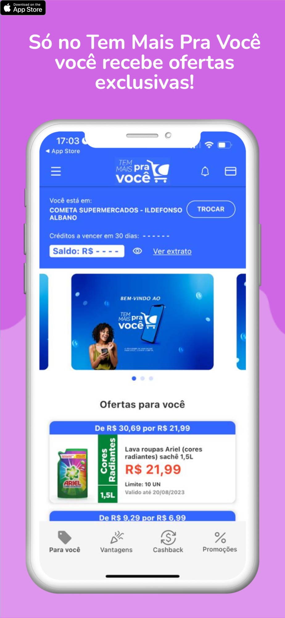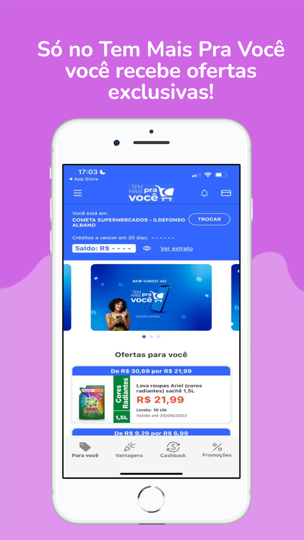 Tem Mais Pra Você é o programa de vantagens exclusivo e gratuito para clientes do Cometa Supermercados. Cadastre-se e tenha acesso a benefícios exclusivos, como: descontos, ofertas com cashback e prêmios.