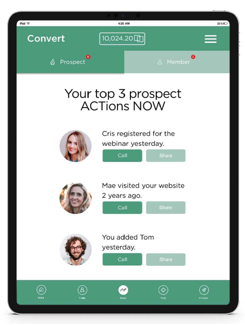We also have member actions prompting you to follow up with team members and customers, as well as share special offers with others.