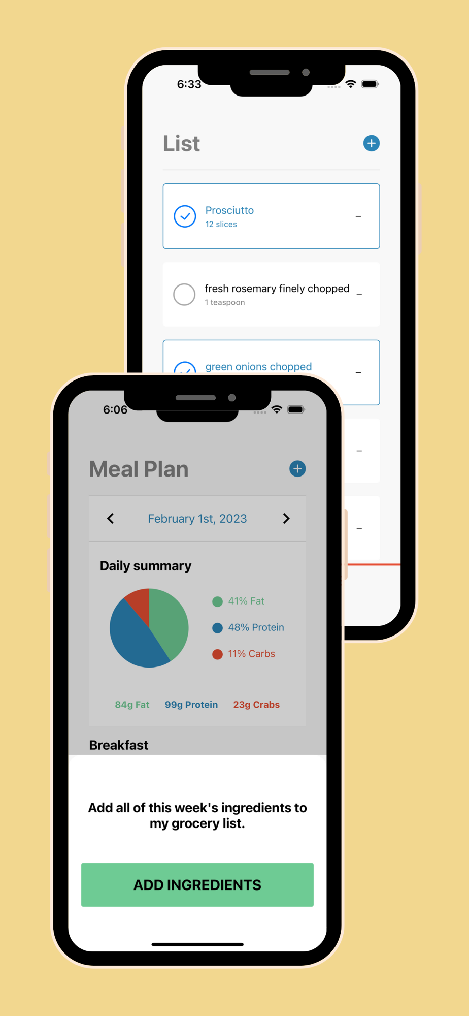 You don't have to worry about counting macros/micros, what to eat for your next meal, or creating a grocery list - that's all built in!