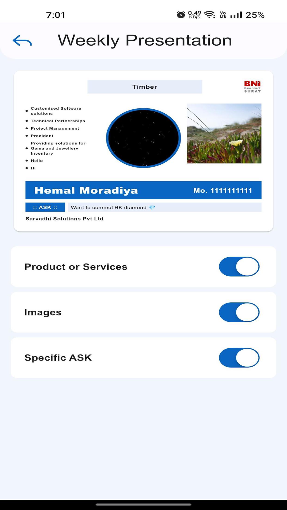 The BNI Mobile App also revolutionizes the way members manage their product and service details. Members can autonomously update their weekly presentations, eliminating the dependence on the slide coordinator or meeting host. Upload up to 5 images and manage your weekly presentation screen with ease. The app also allows you to add specific asks to include in the presentation screen, ensuring every presentation is tailored to your needs.