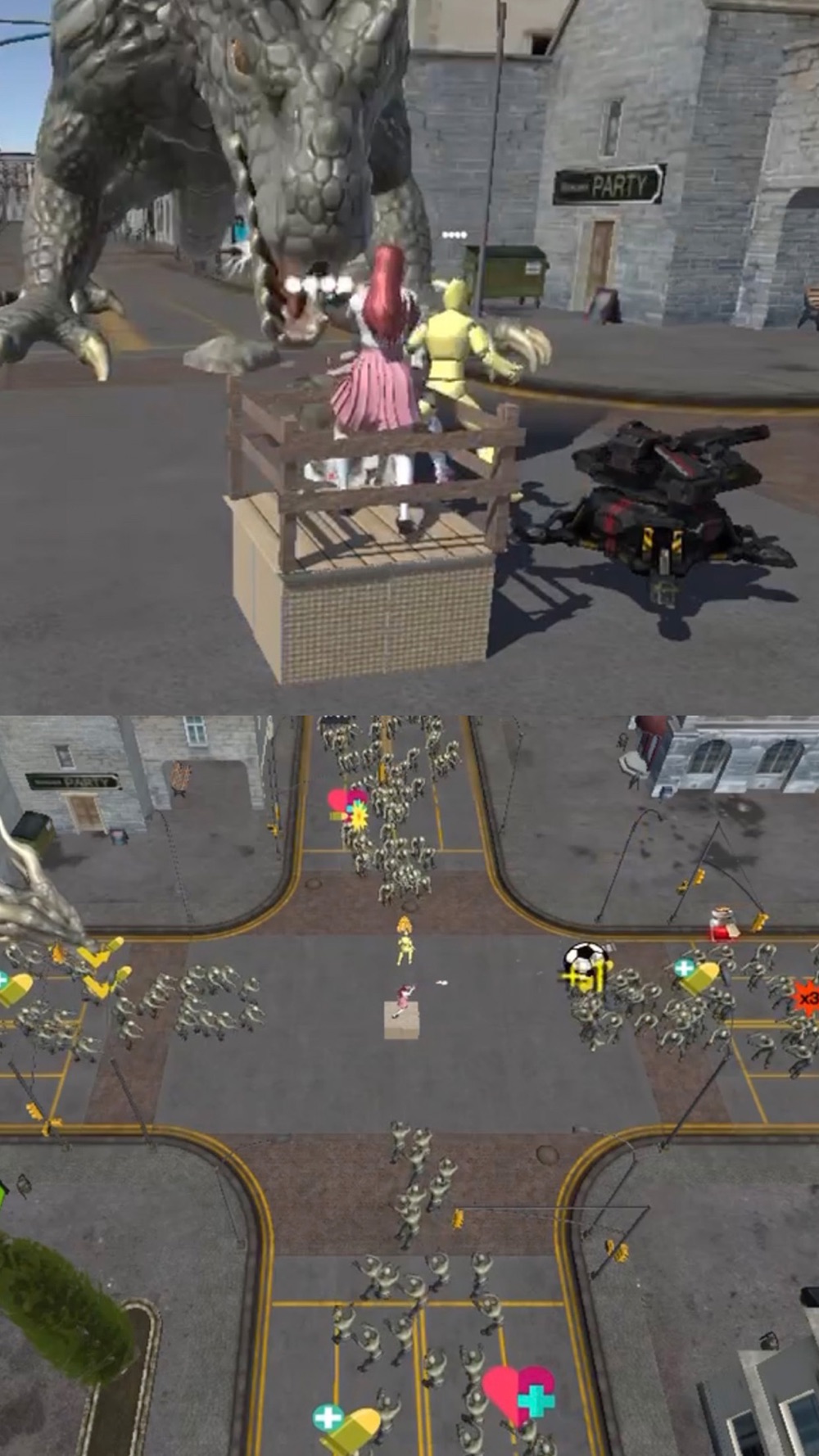 Defense Game. Zombie and Monsters VS Schoolgirl and friends. Shooting. Schoolgirl defend barricade from Zombie and Monsters. She get friends by killing enemy. Friends fight by unique skill. friends: Cat, eagle, Dancer, SnowMan, BananaMan, BombMan, Turrets, etc. Player can buy weapon, armor. Player can craft item. Player can take screenshot and share by pushing camera icon.